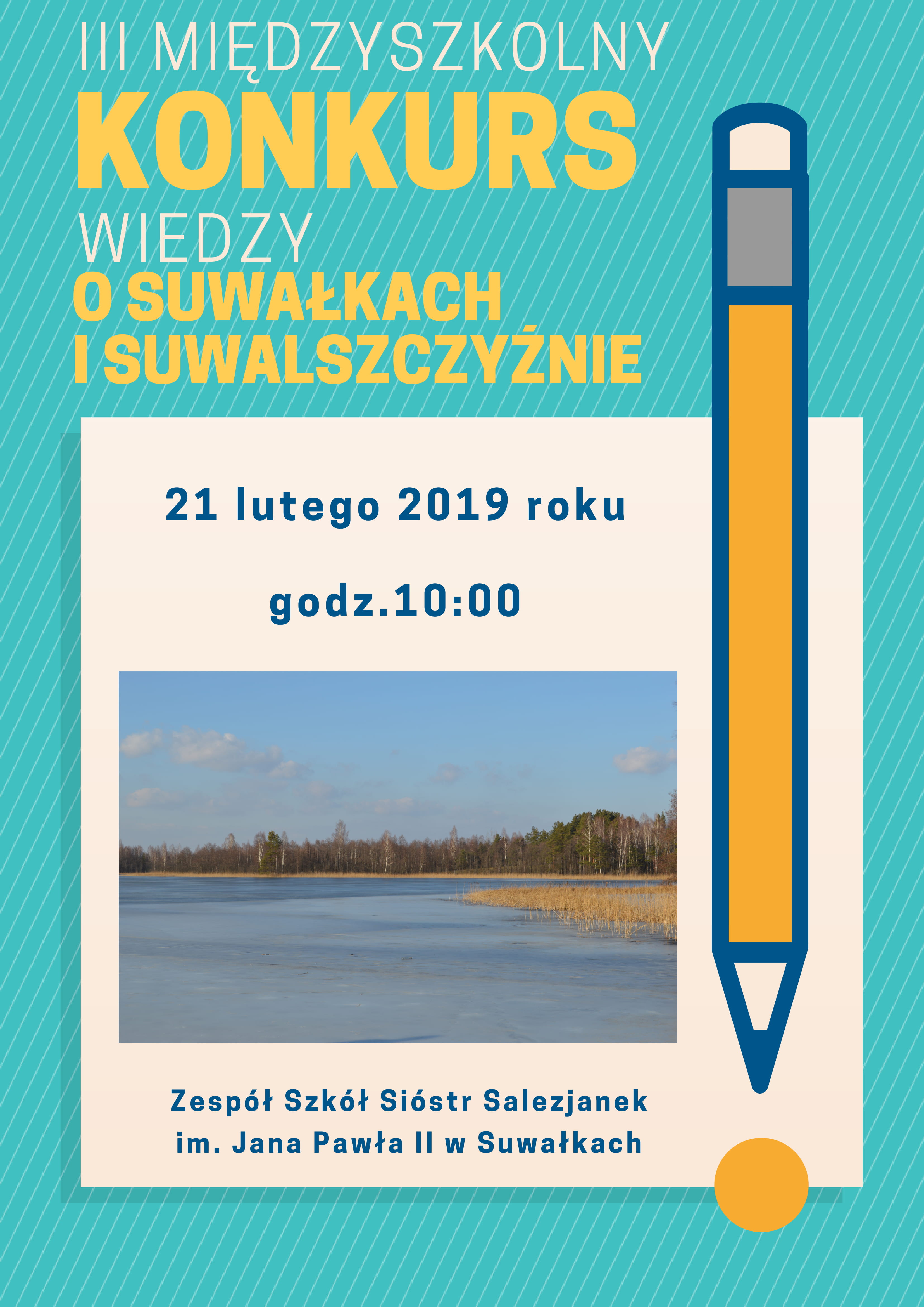 Zespół Szkół Sióstr Salezjanek im. Jana Pawła II w Suwałkach zaprasza siódmoklasistów, ósmoklasistów i gimnazjalistów z Suwałk i powiatu suwalskiego do udziału w III Międzyszkolnym Konkursie Wiedzy o Suwałkach i Suwalszczyźnie.