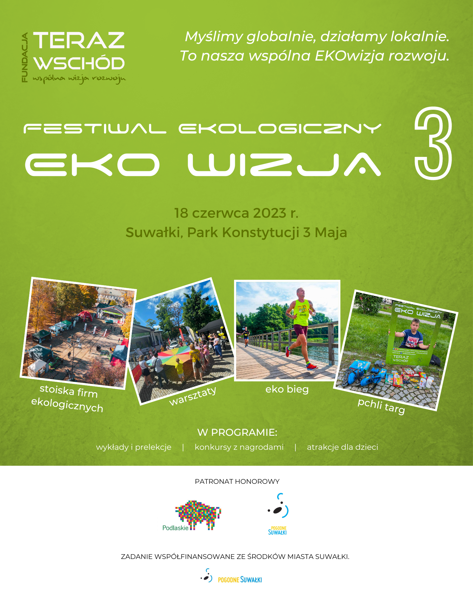 Festiwal Ekologiczny EKO WIZJA 3 odbędzie się 18 czerwca w Parku Konstytucji 3 Maja w Suwałkach. Wstęp na wydarzenie dla odwiedzających jest bezpłatny. Zapraszamy!