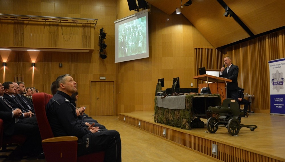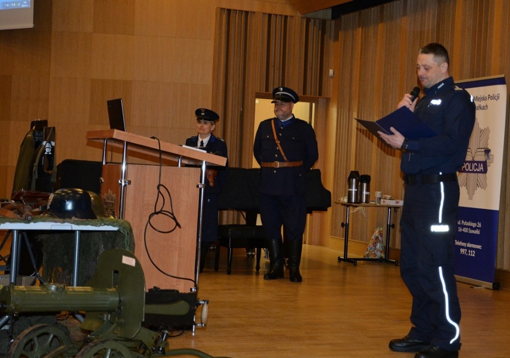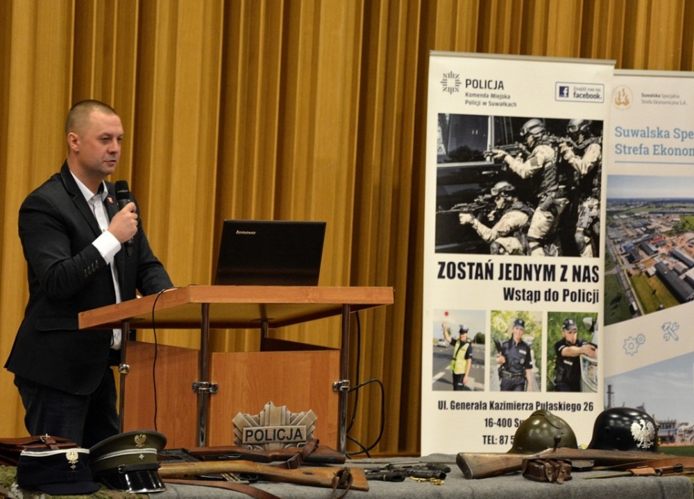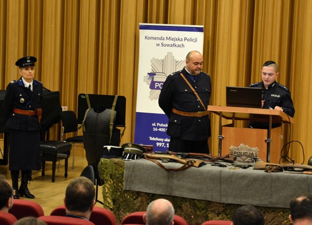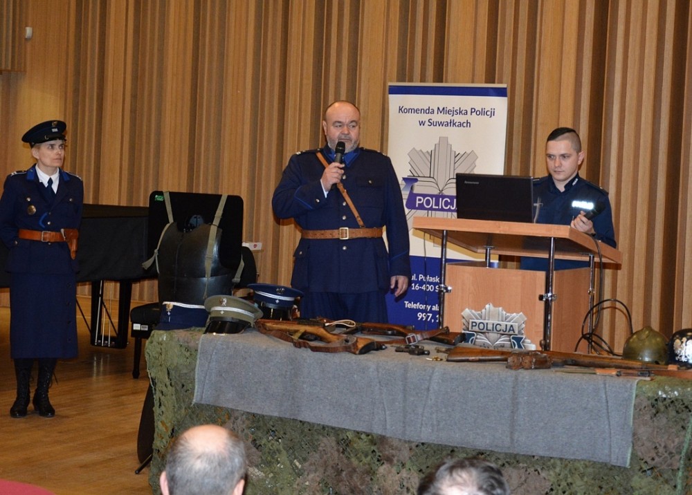 „Spotkanie z historiÄ… Policji”, to przedsiÄ™wziÄ™cie realizowane przez KomendÄ™ MiejskÄ… Policji w SuwaÅ‚kach w zwiÄ…zku z 100. rocznicÄ… powstania polskiej Policji PaÅ„stwowej, która przypada w tym roku. PrzedsiÄ™wziÄ™cie adresowane jest do mÅ‚odzieży, interesujÄ…cej siÄ™ historiÄ… formacji. W formie multimedialnych wykÅ‚adów historycy oraz pasjonaci (kolekcjonerzy i rekonstruktorzy) opowiadali zebranym o Policji dwudziestolecia miÄ™dzywojennego.