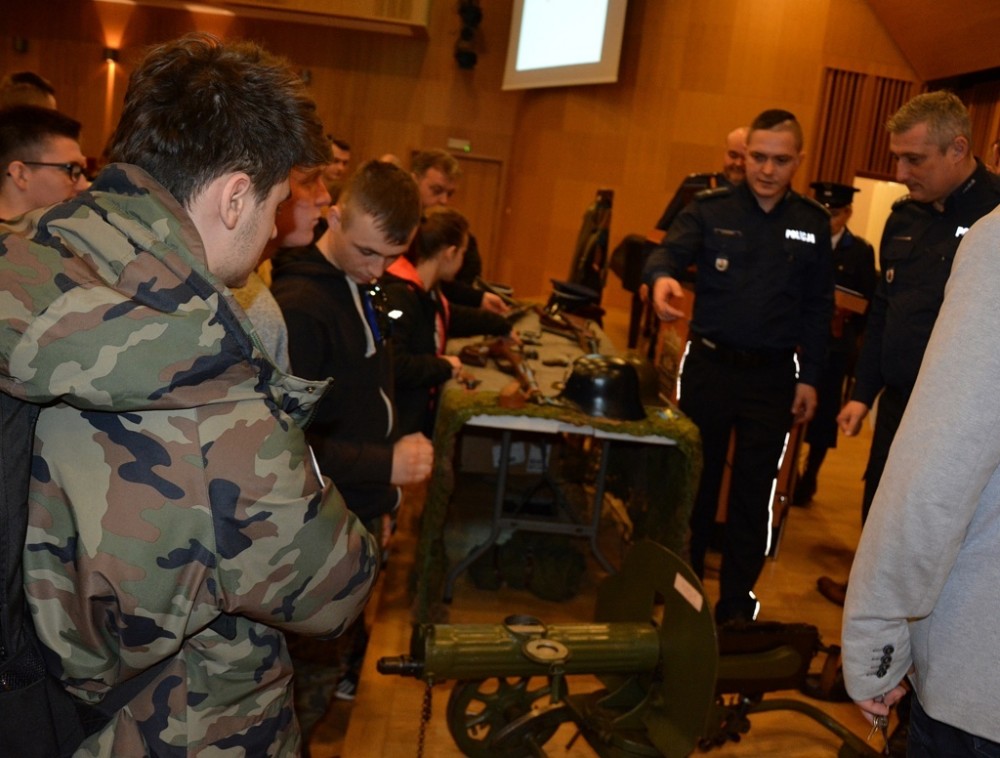 DodatkowÄ… atrakcjÄ… wczorajszej konferencji byÅ‚a prezentacja elementów uzbrojenia i wyposażenia z okresu PP. Warto podkreÅ›lić, że eksponaty prezentowane podczas wczorajszego „Spotkania z historiÄ… Policji” stanowiÅ‚y wyjÄ…tkowe, czÄ™sto niepowtarzalne obiekty historyczne, pochodzÄ…ce ze zbiorów Izby PamiÄ™ci 14 suwalskiego Dywizjonu Artylerii Przeciwpancernej, Grupy Rekonstrukcji Historycznej Policja PaÅ„stwowa ’39 z BiaÅ‚egostoku, Grupy Rekonstrukcji Historycznej 9 PuÅ‚ku Strzelców Konnych w Grajewie, Stowarzyszenia Kolekcjonerów Broni Policyjnej KRYZA w SuwaÅ‚kach. UwagÄ™ mÅ‚odych odbiorców przyciÄ…gnęły m.in. kompletny pancerz kuloodporny wraz z heÅ‚mem, niespotykany letni mundur PP w kolorze khaki, karabiny Mannlicher i Mosin, bardzo rzadki fiÅ„ski pistolet maszynowy SUOMI, oraz pistolety przeznaczone dla policjantek (Mauser 1910, Browning 1906).