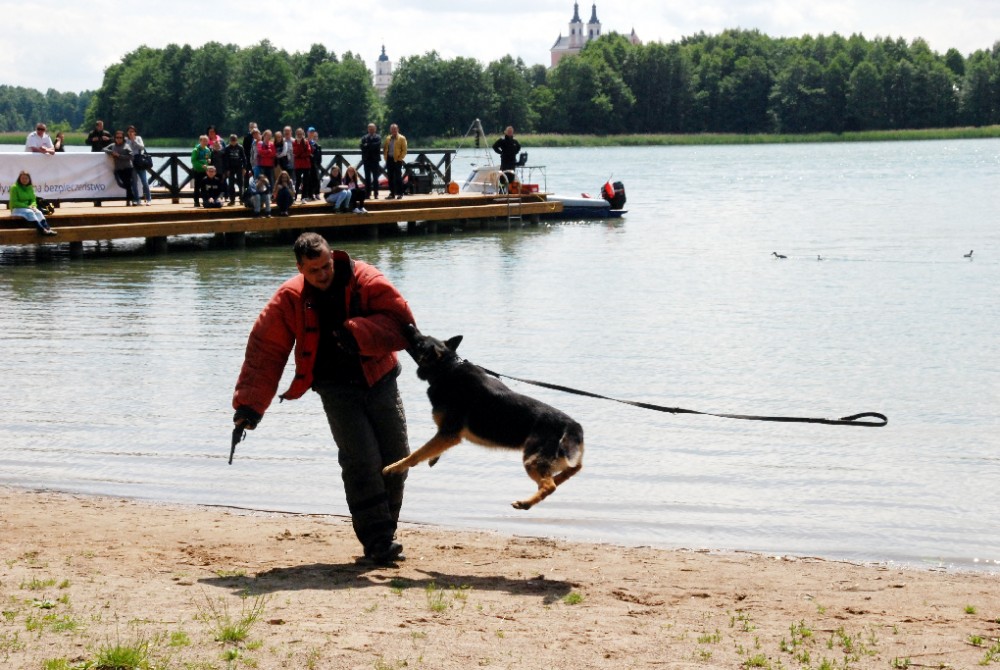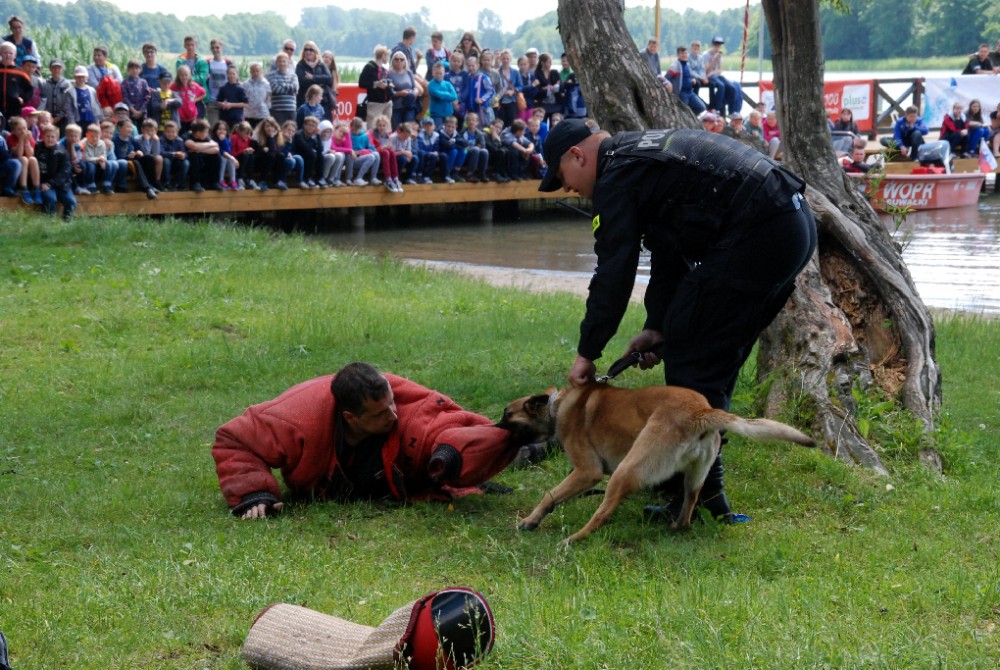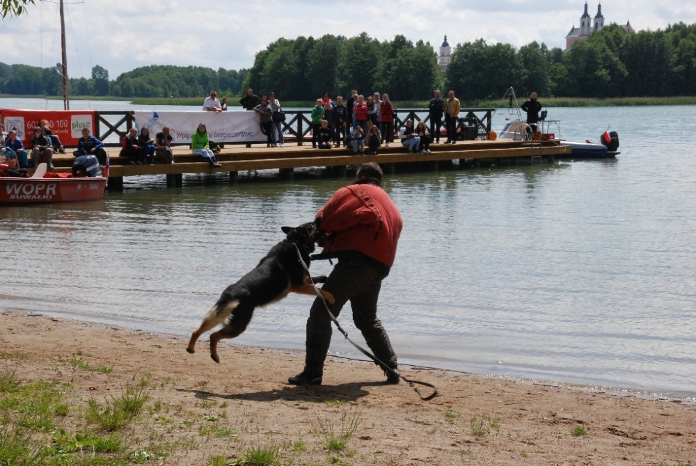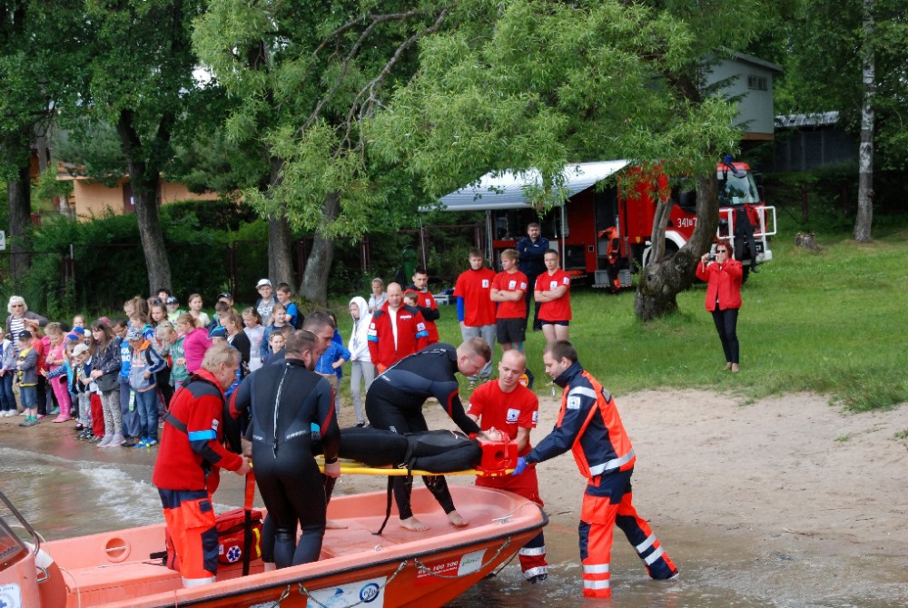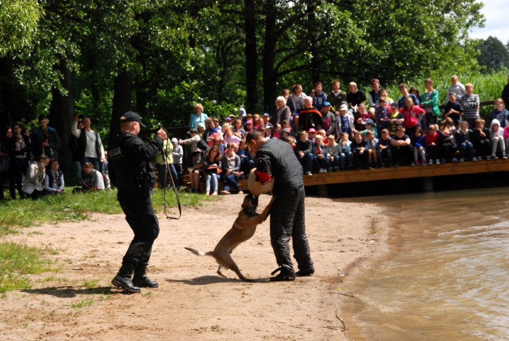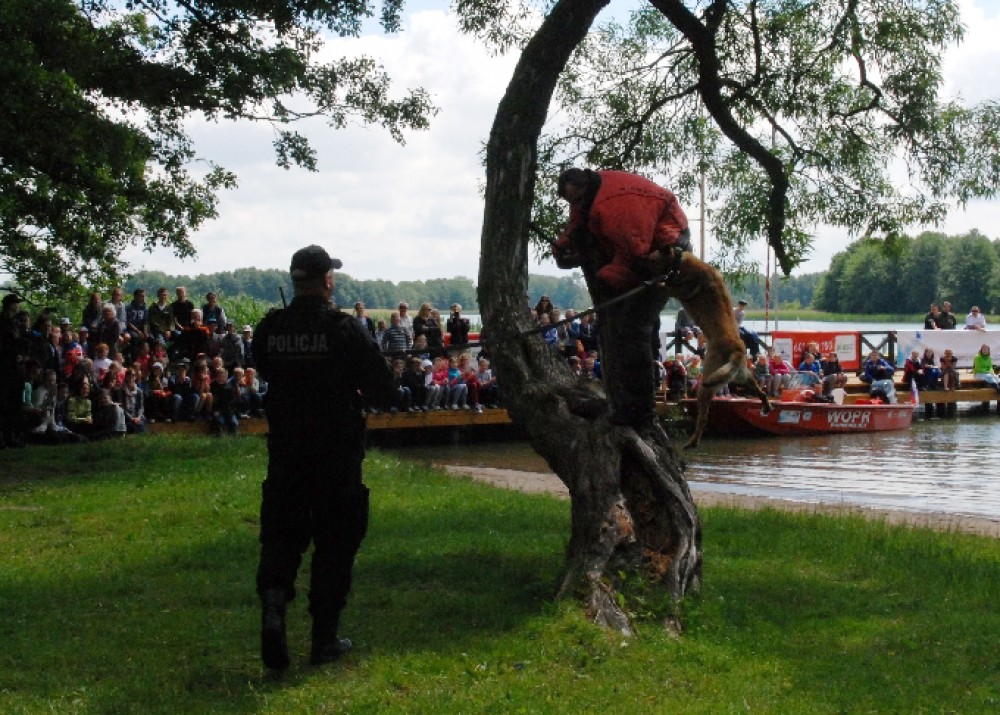 Uczniowie i przedszkolacy oraz mieszkańcy Starego Folwarku na plaży nad jez. Wigry mieli okazję obejrzeć pokazy ratowania osoby tonącej i udzielania jej pierwszej pomocy przedmedycznej i medycznej, sprzętu do ratownictwa wodnego i medycznego oraz praktycznego jego wykorzystania, pokaz tresury i wykorzystania policyjnych psów służbowych.