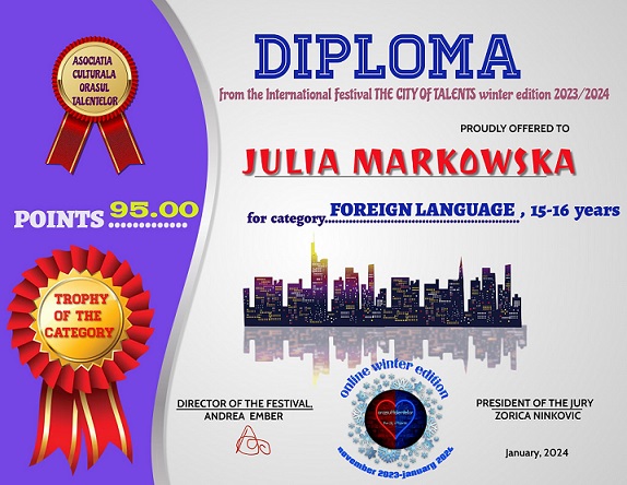 Julia Markowska z III Liceum Ogólnokształcącego w Suwałkach wygrała Międzynarodowy Festiwal „Miasto Talentów 2024” w Rumunii i zdobyła zwycięskie trofeum.