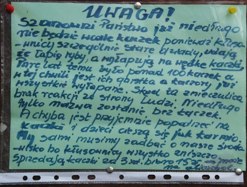 Już niedługo na „Kaczym dołku” nie będzie ... kaczek, ponieważ „kłusownicy, szczególnie stare dziady, udają, że łapią ryby, a wyłapują na wędke kaczki(...), sprzedają kaczki za 3 szt. bioro 15 zł – może na alkohol” to oryginalny fragment apelu, jaki od kilku dni wisi na tablicy ogłoszeń przy „Kaczym dołku”, ozdobie suwalskiego osiedla Północ I.