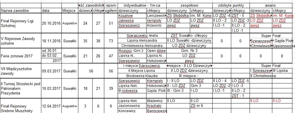 Zawody szkolne oraz dla zawodników dorosÅ‚ych – o Puchar Dyrektora Podlaskiej Organizacji LOK w BiaÅ‚ymstoku ( I poÅ‚owa wrzeÅ›nia 2017 ) oraz o nagrodÄ™ Prezesa Podlaskiej Organizacji Wojewódzkiej LOK w BiaÅ‚ymstoku.