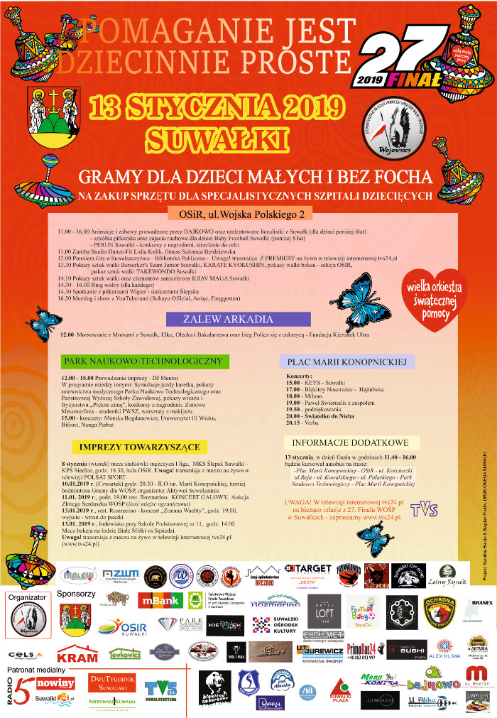 Ramowy plan 27. finału WOŚP 13 stycznia 2019 roku w Suwałkach: