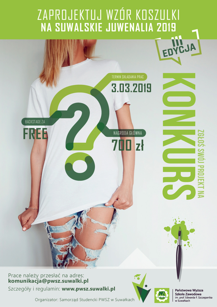 Samorząd Studencki PWSZ ogłasza wyjątkowy konkurs - na projekt koszulki juwenaliowej. W konkursie może wziąć udział każdy - od amatorów do zawodowych grafików. Oprócz nagrody pieniężnej na zwycięzcę czeka wejście na backstage juwenaliów. W poprzednich, dwóch edycjach konkurs cieszył się dużym zainteresowaniem - tak, jak później zwycięskie koszulki.