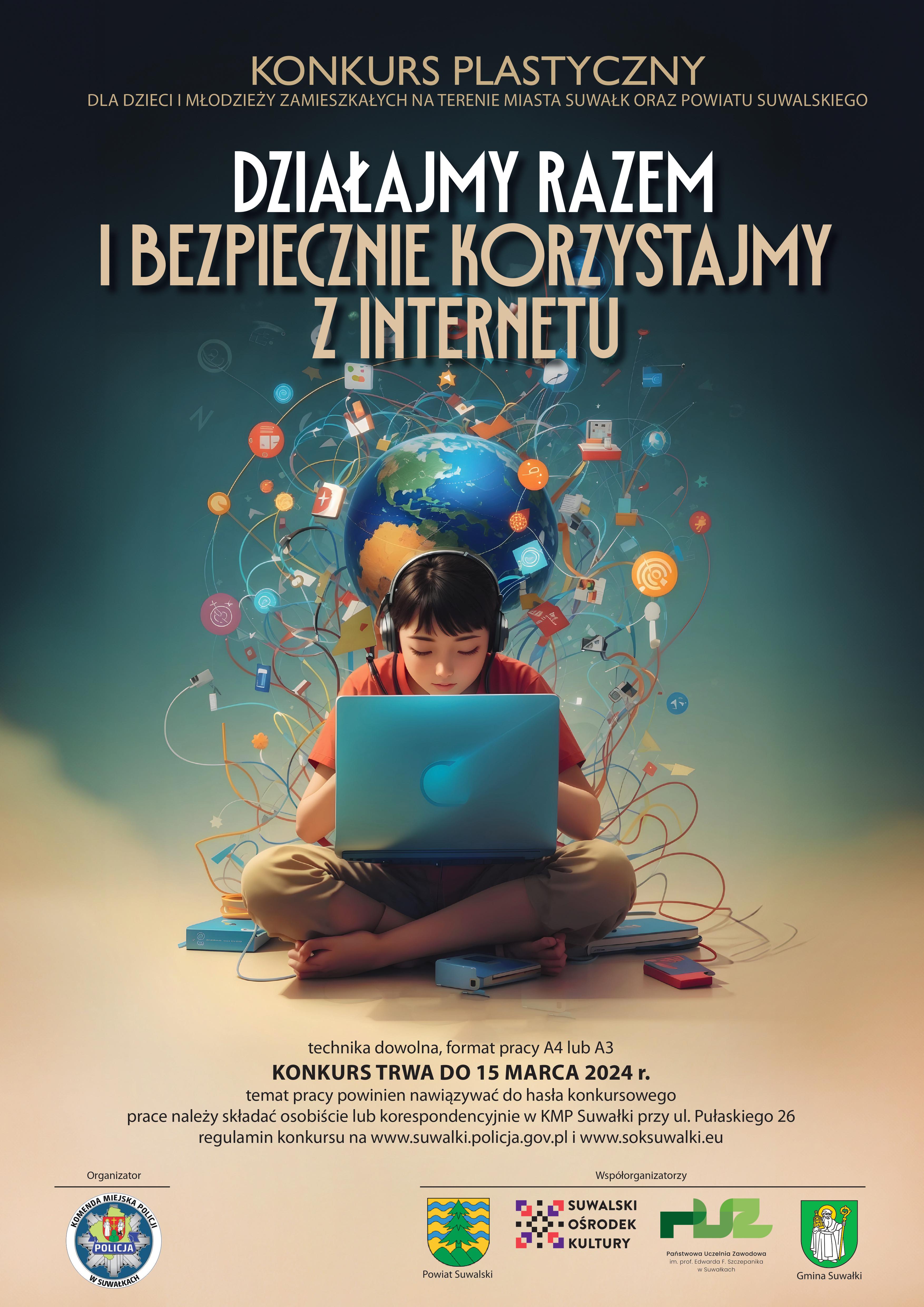 Komenda Miejska Policji w Suwałkach wraz partnerami konkursu: Suwalskim Ośrodkiem Kultury, Starostwem Powiatowym w Suwałkach, Urzędem Gminy Suwałki i Państwową Uczelnią Zawodową, ogłasza konkurs plastyczny „Działamy razem i bezpiecznie korzystamy z Internetu". Prace konkursowe mogą zostać wykonane dowolną techniką plastyczną, pozwalającą na utrwalenie obrazu na arkuszu formatu A3 lub A4. Celem konkursu jest propagowanie właściwych zachowań w sieci, ograniczenie zjawiska cyberprzemocy, uświadomienie młodzieży, dzieciom oraz ich rodzicom jak niebezpieczny może być wirtualny świat, jakie zagrożenia wynikają z niewłaściwego korzystania z Internetu.