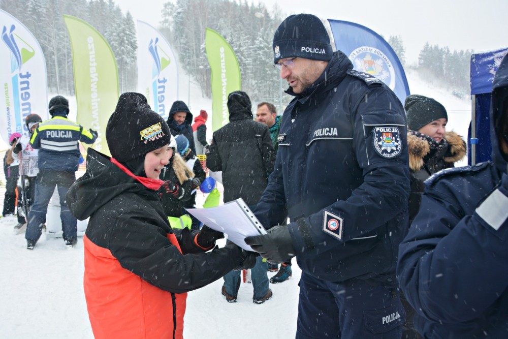 Przy stoisku profilaktycznym licznie zebrane dzieci mogły wziąć udział w konkursach i zabawach organizowanych przez funkcjonariuszy, podczas których utrwalały sobie wiedzę na temat bezpiecznego spędzenia ferii zimowych oraz zasady obowiązujące na stokach całego świata.