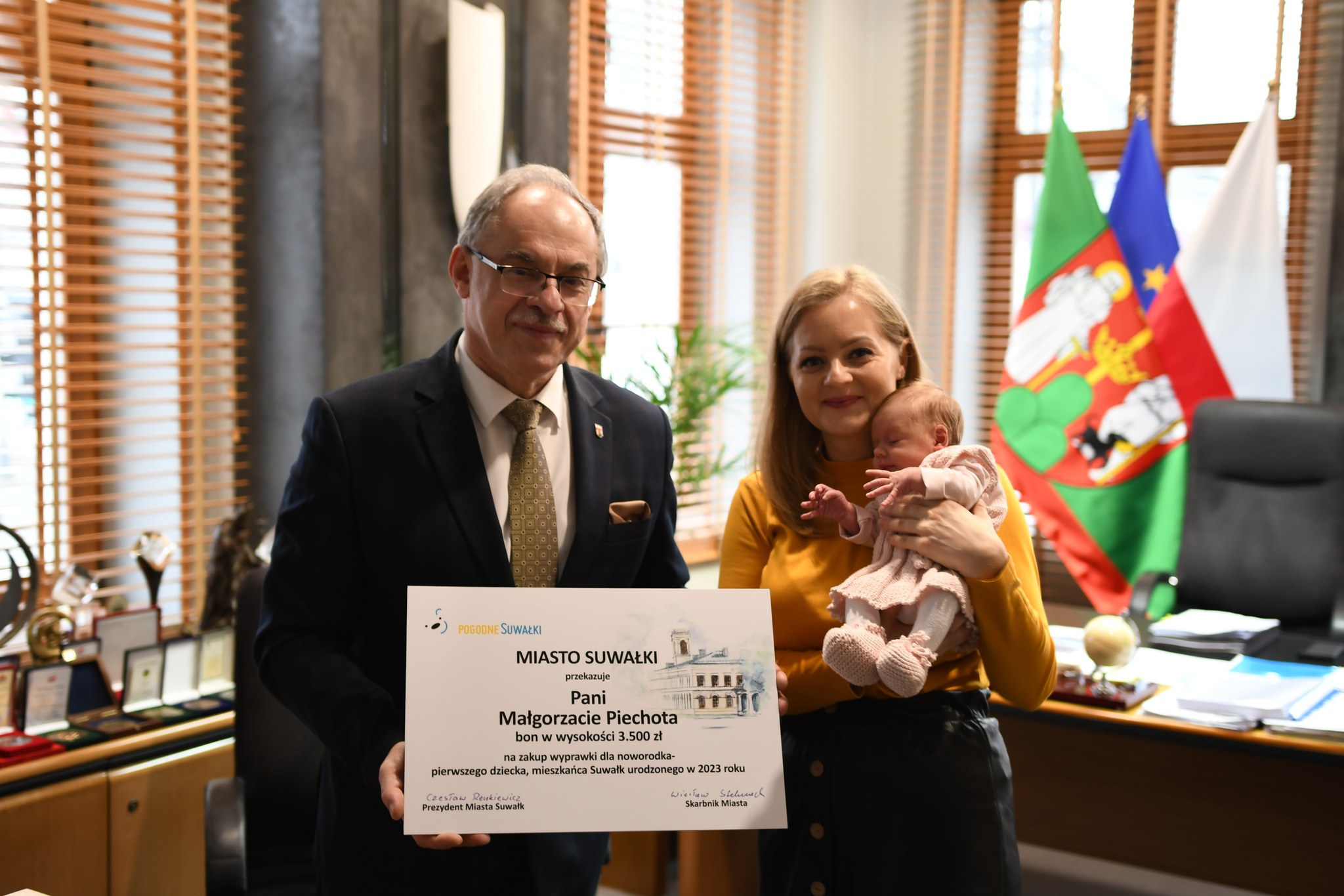 Na rÄ™ce rodziców trafiÅ‚ bon zakupowy o wartoÅ›ci 3,5 tys. zÅ‚otych oraz pamiÄ…tkowy grawerton z gratulacjami oraz życzeniami wszelkiej pomyÅ›lnoÅ›ci. PieniÄ…dze rodzice bÄ™dÄ… mogli wykorzystać w sklepach z artykuÅ‚ami dla niemowlÄ…t.