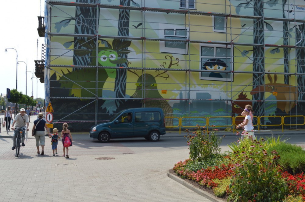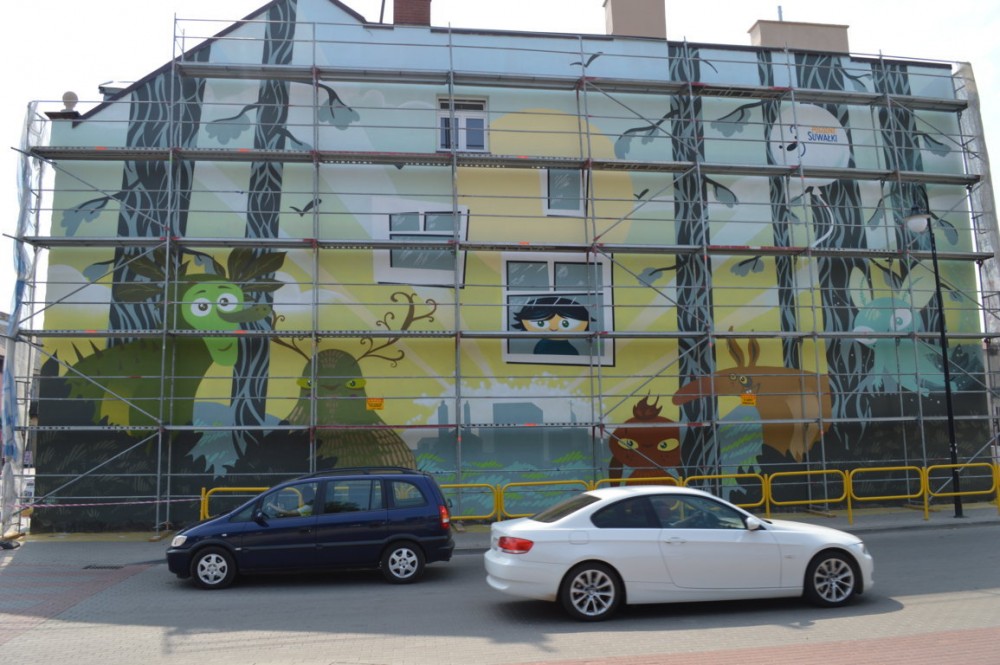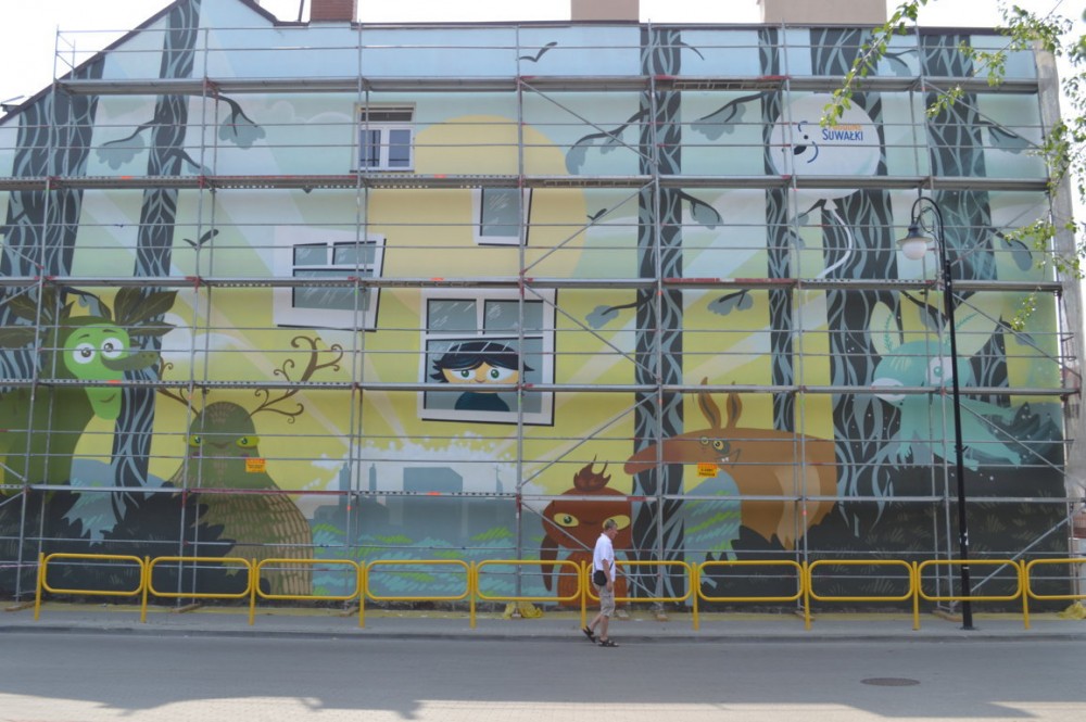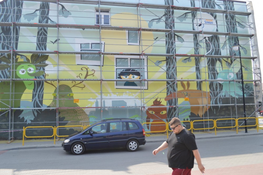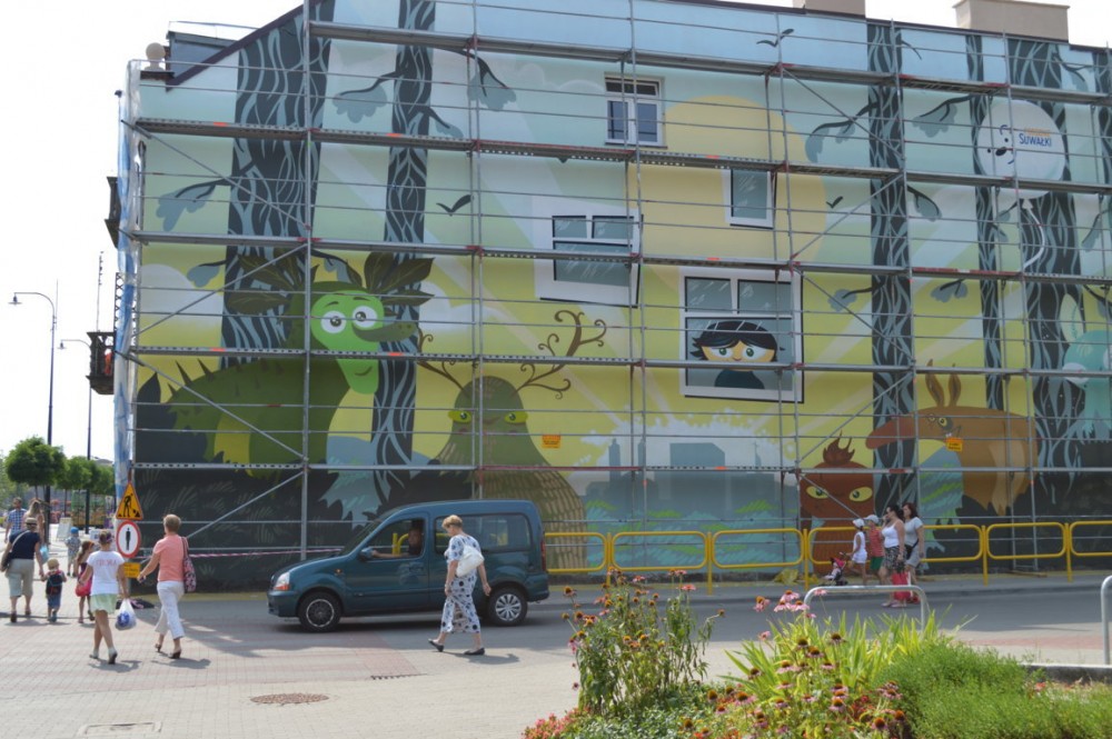 Pod Å›cianÄ… stojÄ… jeszcze rusztowania, ale mural jest bardzo dobrze widoczny. Jak twierdzÄ… suwalczanie, efekt jest niezÅ‚y. Niektórzy sÄ…dzÄ… jednak, że inne projekty konkursowe byÅ‚y lepsze, że lepiej namalować na przykÅ‚ad bobra niż leÅ›ne stwory, albo, że wystarczyÅ‚oby o po prostu wyczyÅ›cić stare cegÅ‚y i nie malować budynku.
