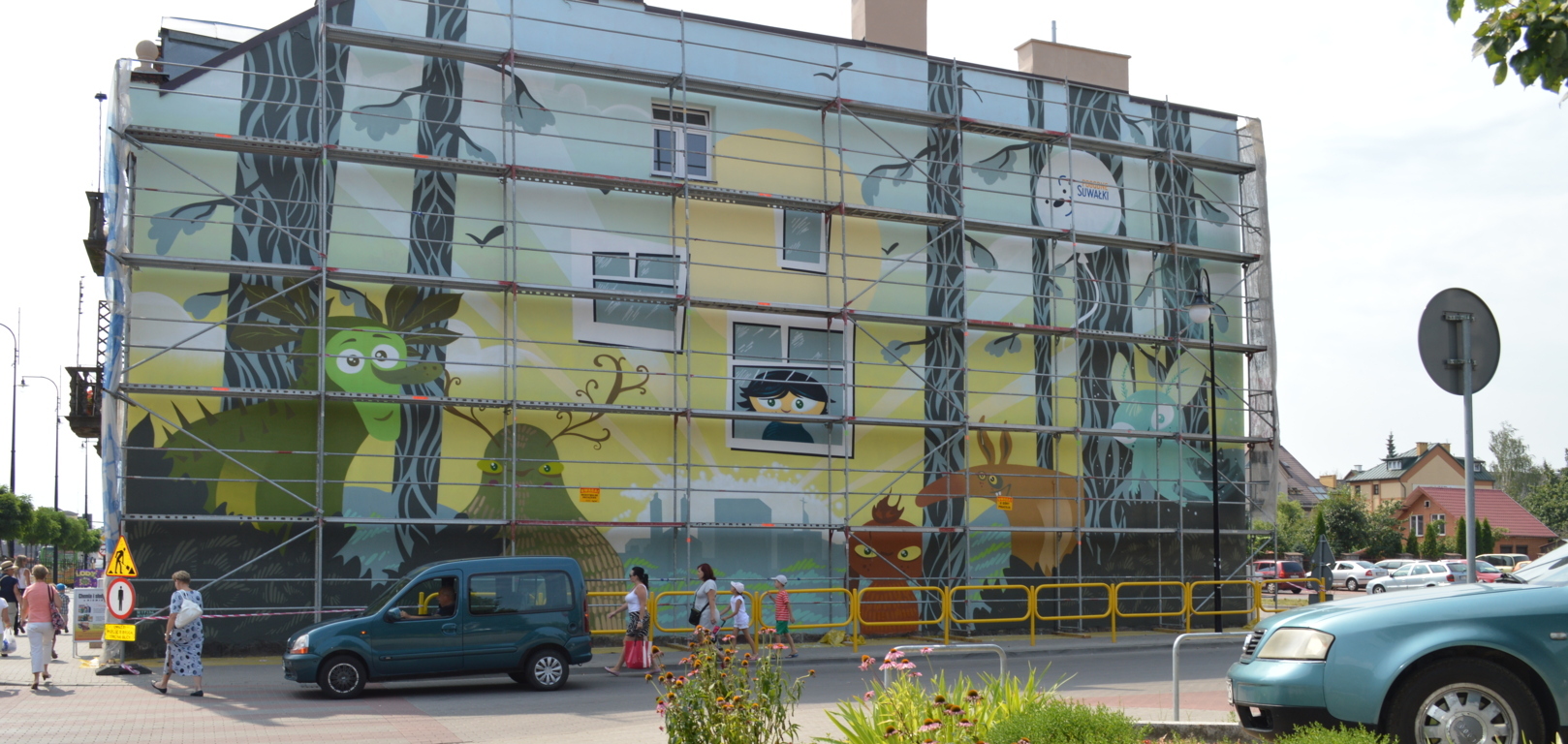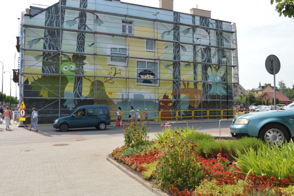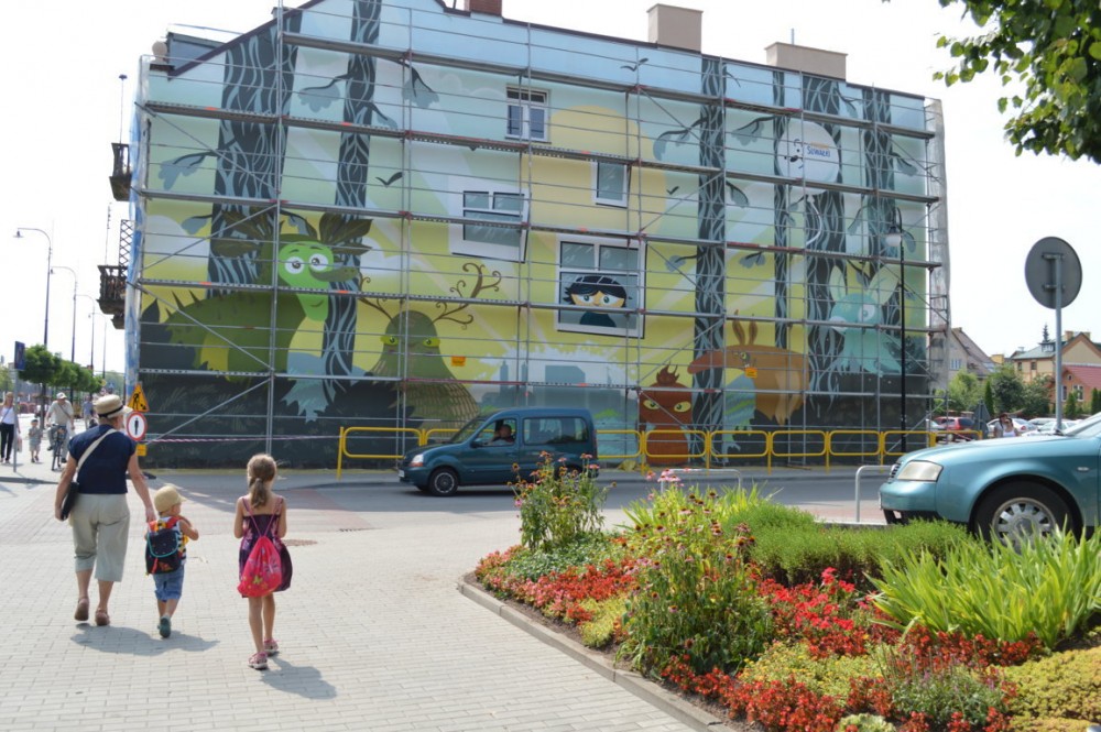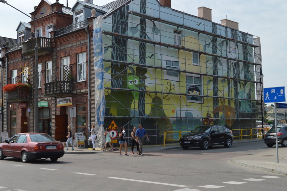 Pod Å›cianÄ… stojÄ… jeszcze rusztowania, ale mural jest bardzo dobrze widoczny. Jak twierdzÄ… suwalczanie, efekt jest niezÅ‚y. Niektórzy sÄ…dzÄ… jednak, że inne projekty konkursowe byÅ‚y lepsze, że lepiej namalować na przykÅ‚ad bobra niż leÅ›ne stwory, albo, że wystarczyÅ‚oby o po prostu wyczyÅ›cić stare cegÅ‚y i nie malować budynku.