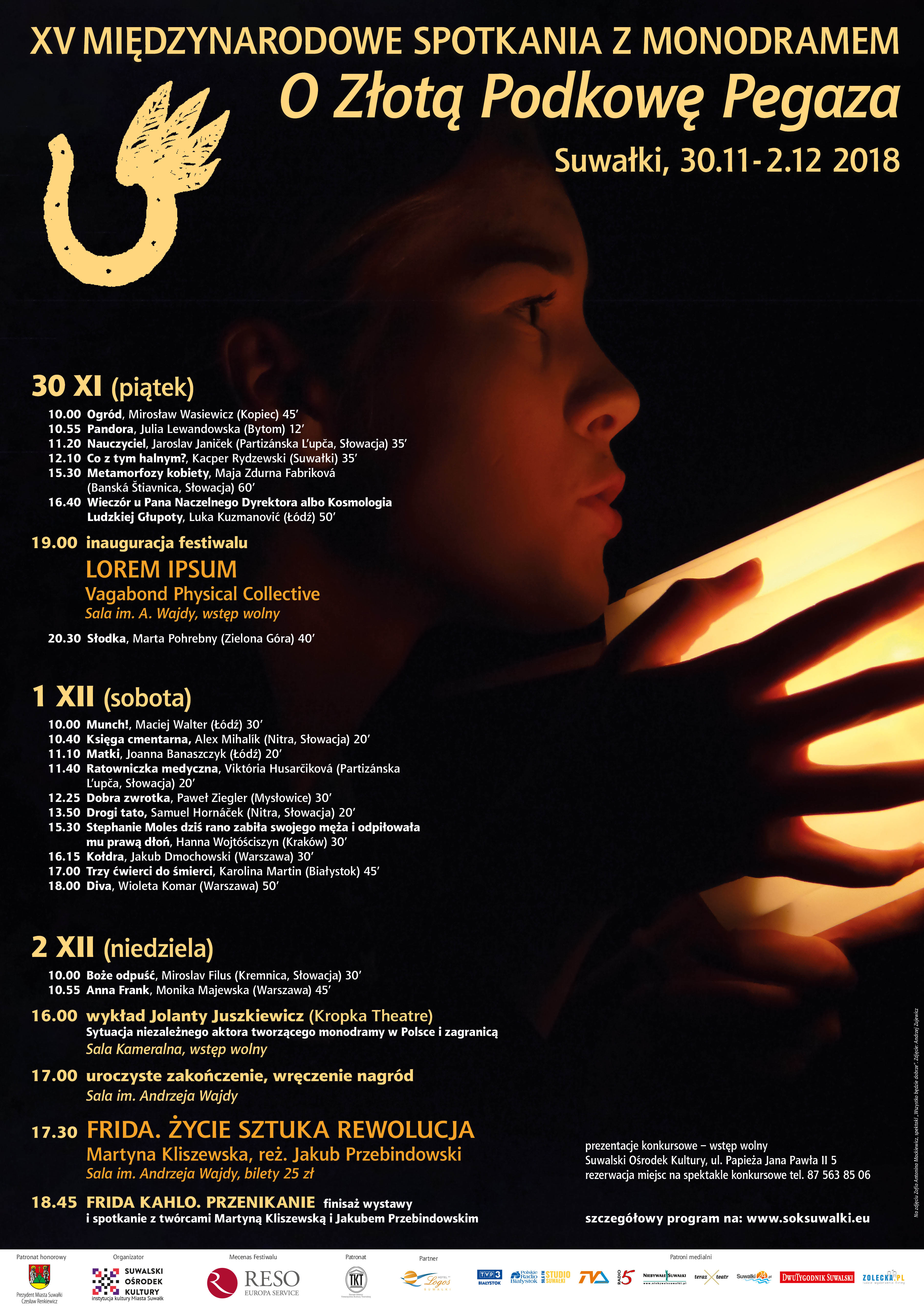 Festiwal zakończy, 2 grudnia, gala wręczenia nagród oraz głośne przedstawienie inspirowane życiem i twórczością meksykańskiej malarki Fridy Khalo w wykonaniu Martyny Kliszewskiej i w reżyserii Jakuba Przebindowskiego.