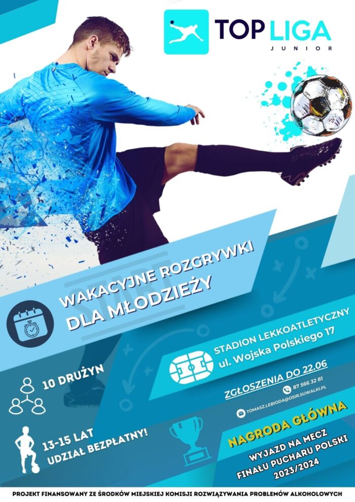 Do czwartku, 22 czerwca OSiR w Suwałkach przyjmuje zgłoszenia do wakacyjnych rozgrywek TOP LIGA Junior. Warto wziąć w nich udział, ponieważ na najlepszą drużynę juniorów czeka wyjazd na Finał Pucharu Polski, który w przyszłym roku odbędzie się już tradycyjnie w Warszawie na Stadionie Narodowym.