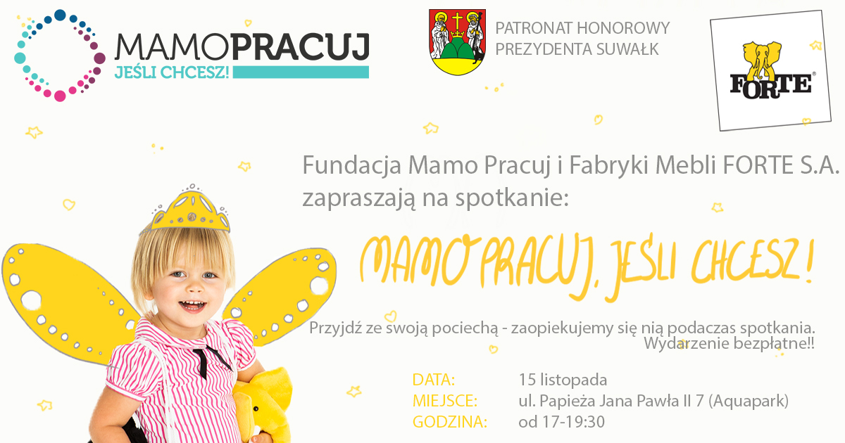 Spotkanie „Mamo pracuj, jeśli chcesz” przeznaczone jest dla mam, które pragną wrócić do pracy po dłuższej przerwie. To bardzo ważna decyzja i zmiana życiowa nie tylko dla samych kobiet, ale także dla całych rodzin. Dlatego Fundacja Mamo Pracuj oraz FABRYKI MEBLI „FORTE” S.A. zapraszają do udziału w wydarzeniu, którego celem jest wspieranie kobiet poszukujących pracy pozwalającej łączyć życie rodzinne z zawodowym. Podczas spotkania uczestniczki dowiedzą się, jak skutecznie szukać wymarzonej posady oraz jak się organizować w życiu, aby zachować równowagę między życiem zawodowym i prywatnym. Będzie to również doskonała okazja do spotkania z pracodawcami przyjaznymi mamom, takimi jak FORTE. Wydarzenie objęte jest Patronatem Honorowym Prezydenta Miasta Suwałk.