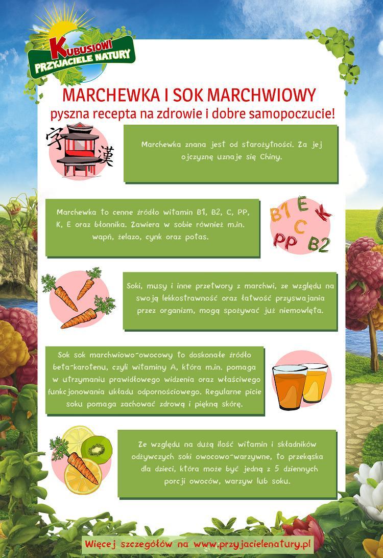 Jednym, z najlepszych sposobów na dobre samopoczucie każdego dnia jest regularne jedzenie marchewki czy picie soków marchwiowo-owocowych, bÄ™dÄ…cych elementami zbilansowanej i zróżnicowanej diety, która jest podstawÄ… zdrowego stylu życia. Dlatego od dziÅ› podejmijmy wyzwanie „Kubusiowych PrzyjacióÅ‚ Natury” i razem z naszymi dziećmi chrupmy oraz pijmy „maÅ‚e co nieco” przygotowane z marchewki: na Å›niadanie, obiad czy kolacjÄ™.