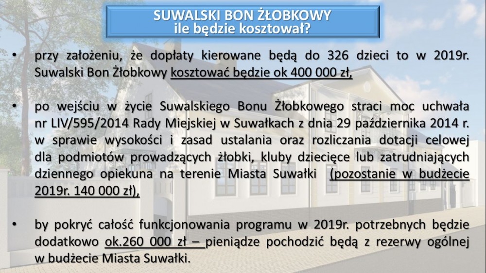 Po wejÅ›ciu w życie Suwalskiego Bonu Żłobkowego straci moc uchwaÅ‚a Rady Miejskiej w SuwaÅ‚kach w sprawie wysokoÅ›ci i zasad ustalania oraz rozliczania dotacji celowej dla podmiotów prowadzÄ…cych żłobki, kluby dzieciÄ™ce lub zatrudniajÄ…cych dziennego opiekuna na terenie Miasta SuwaÅ‚ki. Dlatego też w budżecie Miasta SuwaÅ‚ki na 2019r. pozostanie kwota 140 000 zÅ‚