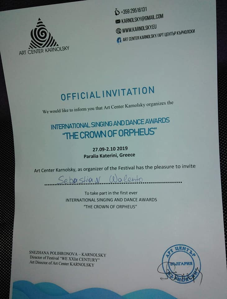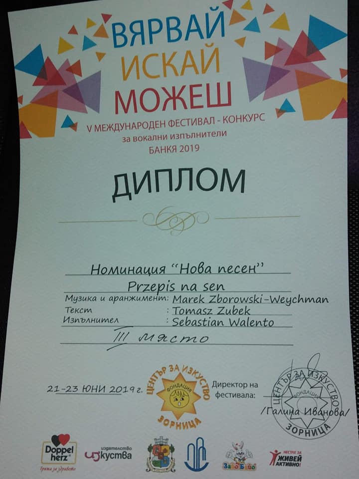 Sebastian Walento wystąpił na festiwalu "Wiarvai, iskai, możesz" w Sofii w Bułgarii. I to z sukcesem - dwukrotnie zdobył trzecie miejsca - raz jako wykonawca piosenki zagranicznej, raz jako wykonawca piosenki nowej.
