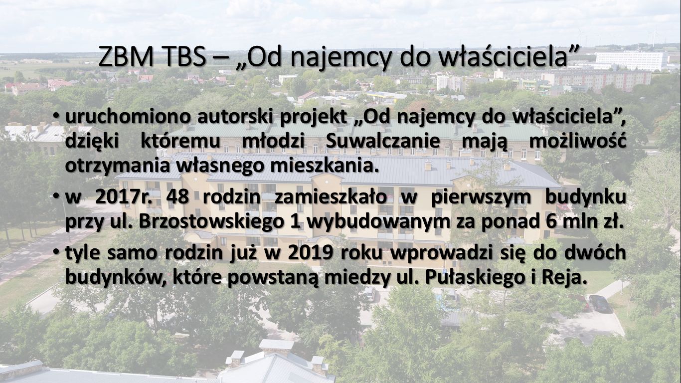 Przez te sześć lat sytuacja na rynku mieszkaniowym mocno siÄ™ zmieniÅ‚a. Nie ma bezrobocia, a część pracujÄ…cych zarabia tyle, że stać ich na kupno mieszkania u dewelopera, albo na udziaÅ‚ w programie ZBM TBS „Od najemcy do wÅ‚aÅ›ciciela”.