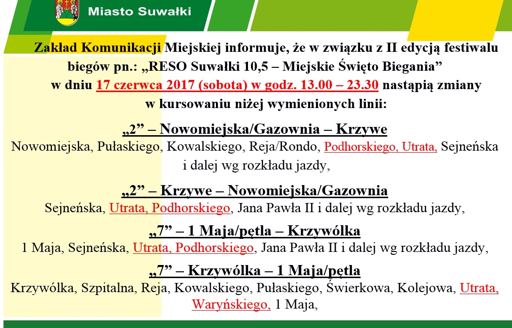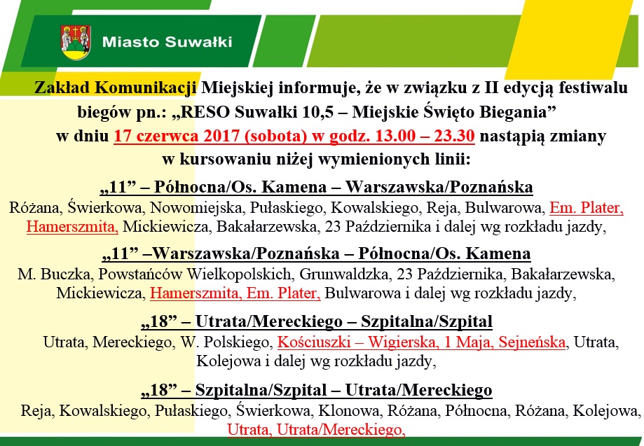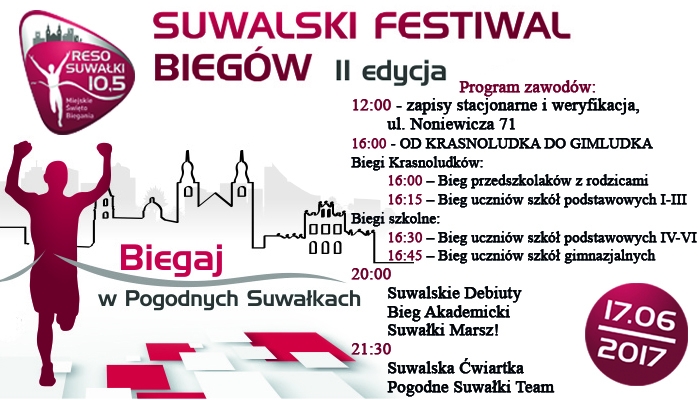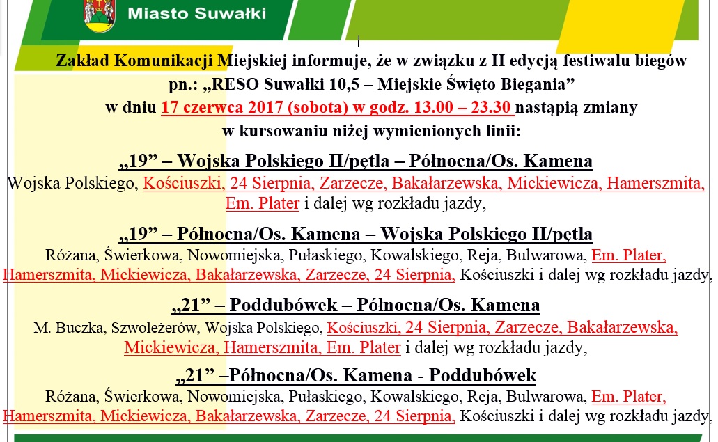 Ośrodek Sportu i Rekreacji w Suwałkach informuje, iż w związku z RESO Suwałki 10,5 – Miejskie Święto Biegania w sobotę, 17 czerwca z ruchu zostaną wyłączone niektóre odcinki suwalskich ulic. I tak: