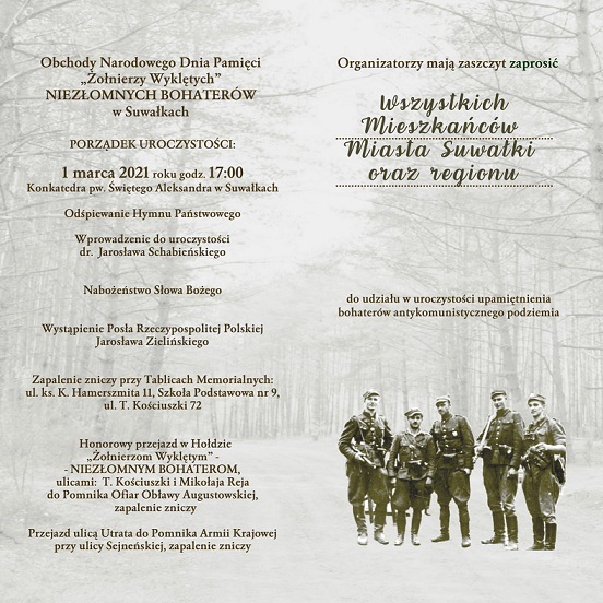 Ks. praÅ‚. StanisÅ‚aw Wysocki oraz ZwiÄ…zek Harcerstwa Rzeczpospolitej Hufiec w SuwaÅ‚kach zapraszajÄ… wszystkich mieszkaÅ„ców, którzy chcÄ… upamiÄ™tnić tych, którzy od 1944 do 1963 roku walczyli o prawo do samostanowienia polskiego spoÅ‚eczeÅ„stwa, stawiajÄ…c zbrojny opór sowieckiej okupacji i narzuconej przez MoskwÄ™ wÅ‚adzy komunistycznej do uczestnictwa w Suwalskich Obchodach Narodowego Dnia PamiÄ™ci Å»oÅ‚nierzy WyklÄ™tych.
