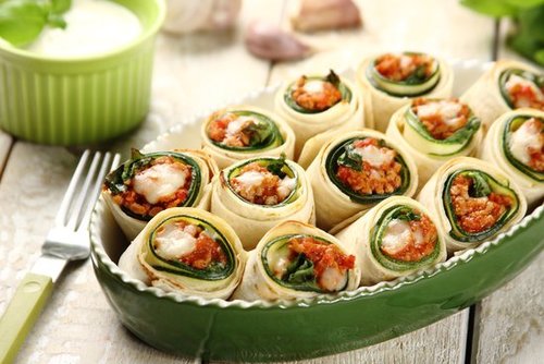 - Plastry cukinii osusz, rozÅ‚óż na desce, naÅ‚óż Å‚yżkÄ… miÄ™sny sos, posyp z wierzchu tartym serem, w każdÄ… roladkÄ™ wÅ‚óż liść bazylii i caÅ‚ość zwiÅ„. CukiniÄ™ zawiÅ„ dodatkowo w 3 centymetrowy pasek tortilli. Gotowe roladki ukÅ‚adaj w żaroodpornym naczyniu.