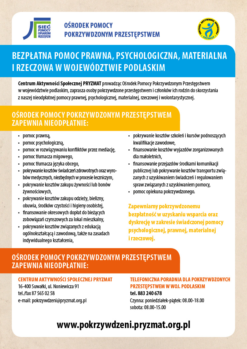 Centrum Aktywności Społecznej PRYZMAT prowadzi Ośrodek Pomocy dla Osób Pokrzywdzonych Przestępstwem w województwie podlaskim i zaprasza osoby pokrzywdzone przestępstwem i członków ich rodzin do skorzystania z naszej nieodpłatnej pomocy prawnej, psychologicznej, materialnej, rzeczowej i wolontarystycznej.