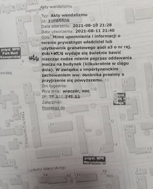 Swój problem naniósÅ‚ i opisaÅ‚ na Krajowej Mapie ZagrożeÅ„ BezpieczeÅ„stwa jeden z mieszkaÅ„ców SuwaÅ‚k, który od pewnego czasu miaÅ‚ problem z mężczyznÄ… nagminnie zaÅ‚atwiajÄ…cym swoje potrzeby fizjologiczne na jego podwórku przy Placu Marii Konopnickiej. "Intruz" nic sobie nie robiÅ‚ z upomnieÅ„ wÅ‚aÅ›ciciela posesji. SprawÄ… zajÄ™li siÄ™ policjanci z WydziaÅ‚u Prewencji, którzy ustalili sprawcÄ™ nieobyczajnych wybryków. PomógÅ‚ im opis naniesiony na wspomnianej platformie. OkazaÅ‚ siÄ™ nim 18-letni mieszkaniec gminy SuwaÅ‚ki. Mężczyzna zostaÅ‚ już przesÅ‚uchany jako sprawca wykroczenia. Teraz jego sprawÄ… zajmie siÄ™ sÄ…d.