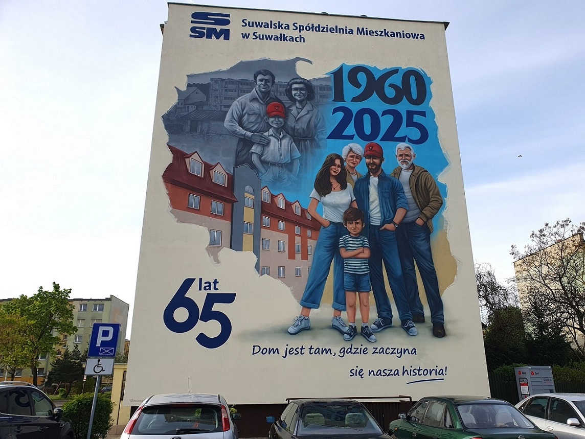 Dom jest tam, gdzie zaczyna się nasza historia – takie motto zdobi mural, jaki pojawił się na bloku przy ul. Korczaka 5. Dzieło powstało z okazji 65-lecia Suwalskiej Spółdzielni Mieszkaniowej.