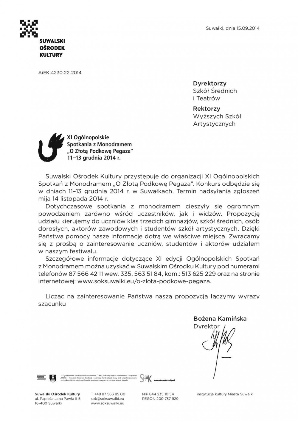 Szczegółowe informacje dotyczące XI edycji Ogólnopolskich Spotkań z Monodramem można uzyskać pod nr tel. 87/ 566 42 11 wew. 335, 563 51 84 i na www.soksuwalki.eu/o-zlota-podkowe-pegaza. Dyrektorem artystycznym festiwalu jest Pani Grażyna Filipowicz-Karp, tel. 513 526 229, e-mail: grazyna.filipowicz_karp@soksuwalki.eu.
