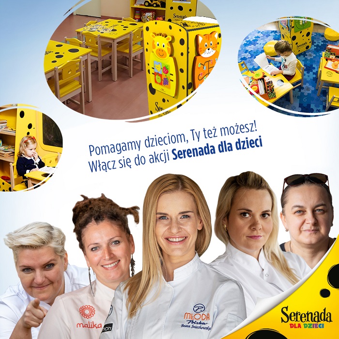 Do tegorocznej edycji akcji Serenada dla dzieci włączyło się 5 znanych i lubianych szefowych kuchni: Joanna Jakubiuk, Anna Klajmon, Ewa Malika Szyc-Juchnowicz, Sylwia Stachyra i Beata Śniechowska. Szefowe podczas pierwszego etapu zachęcały do zgłaszania placówek z całego kraju, które potrzebują kącików zabaw. Otrzymały ponad 250 zgłoszeń! Spośród nich, na podstawie uzasadnień, wybrały 20 miejsc, które trafiły do dalszego etapu - głosowania. Obecnie angażują do oddawania głosów na stronie: https://serenadadladzieci.pl/zaglosuj/. Jest o co walczyć – dzięki akcji powstanie 5 nowych, wyposażonych w wieże zabaw, kolorowe meble, zabawki i kolorowanki kącików zabaw, w miejscach gdzie są najbardziej potrzebne.