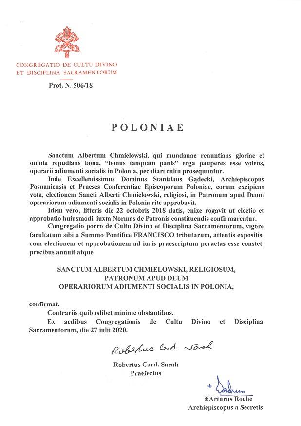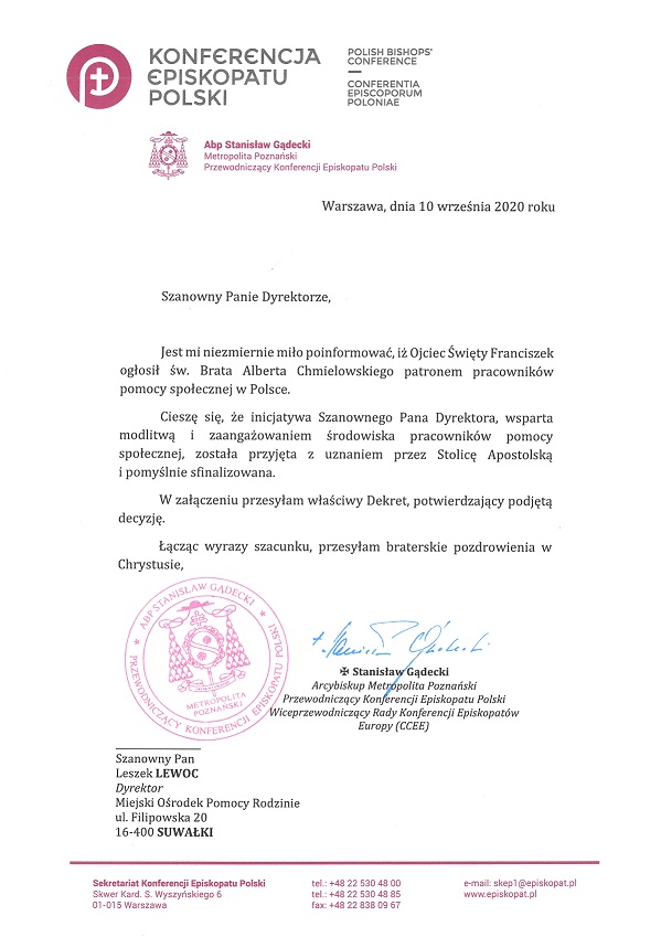 Z inicjatywy Leszka Lewoca, dyrektora Miejskiego Ośrodka Pomocy Rodzinie w Suwałkach Ojciec Święty Franciszek ogłosił św. Brata Alberta Chmielowskiego patronem pracowników pomocy społecznej w Polsce.