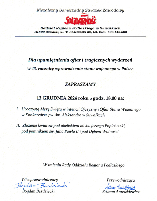 Do upamiętnienia ofiar i tragicznych wydarzeń stanu wojennego w Polsce zaprasza Rada Oddziału Regionu Podlaskiego Niezależnego Samorządnego Związku Zawodowego „Solidarność w Suwałkach.