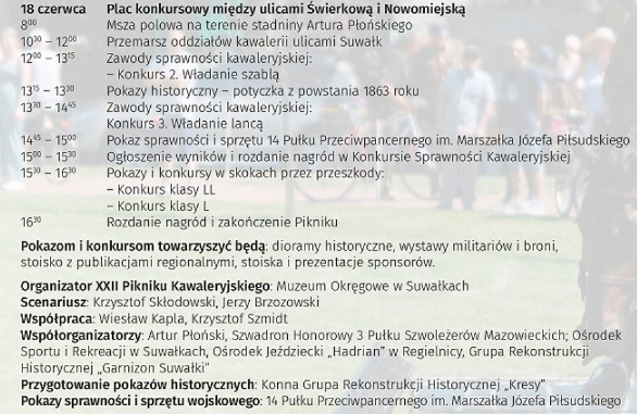 W niedzielę oddziały kawalerii przemaszerują ulicami Suwałk na plac za komendą policji przy Świerkowej i Nowomiejskiej, gdzie od godz. 12:00 odbywać się będę konkursy władania szablą oraz lancą, zawody w skokach przez przeszkody, zaprezentowana zostanie potyczka z Powstania Styczniowego oraz odbędzie się pokaz sprawności i sprzętu 14 Pułku Przeciwpancernego w Suwałkach.