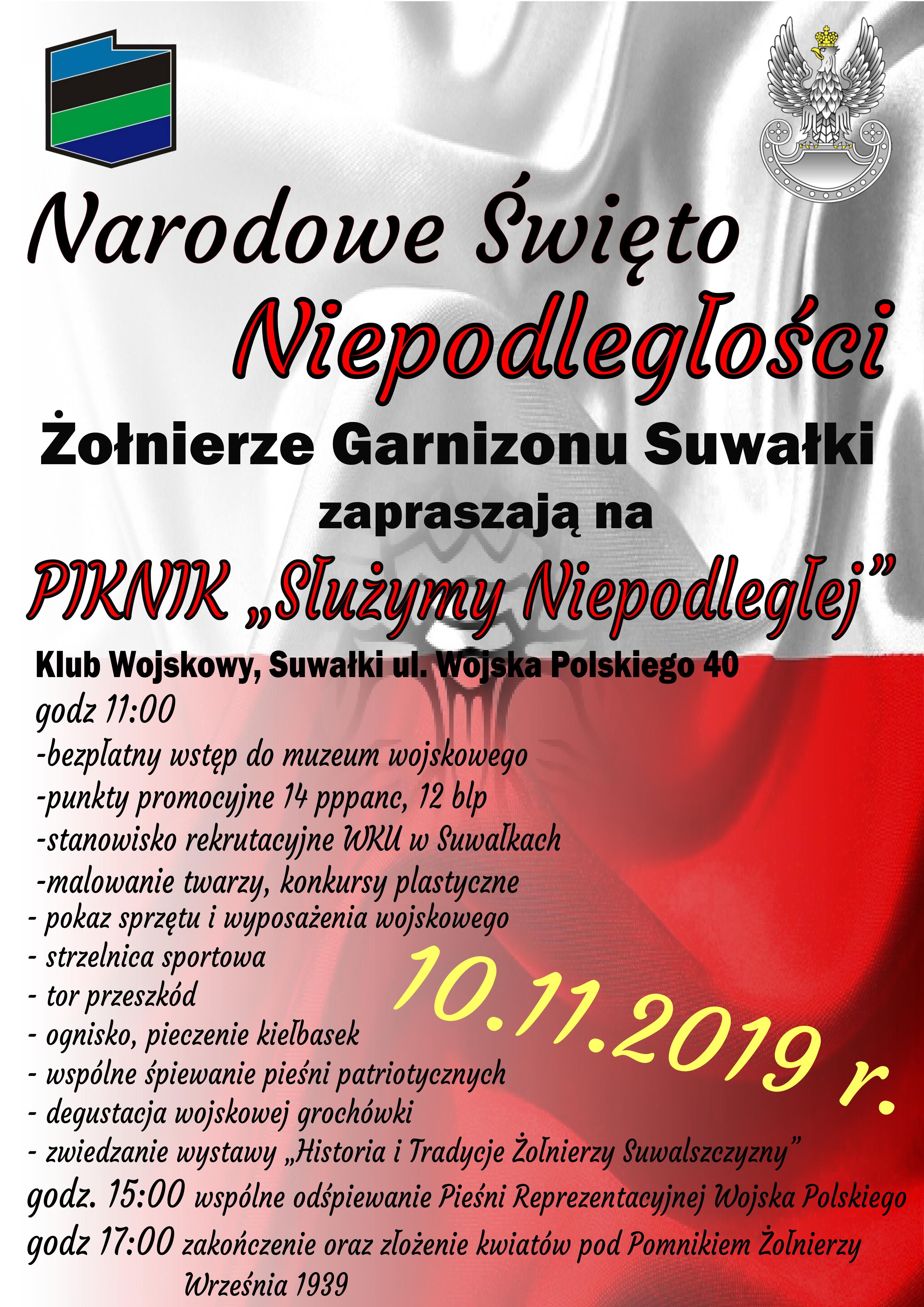 Żołnierze Garnizonu Suwałki zapraszają do udziału w Pikniku „Służymy Niepodległej”, który odbędzie się w niedzielę, 10 listopada, na terenie Klubu Wojskowego przy ul. Wojska Polskiego 40.