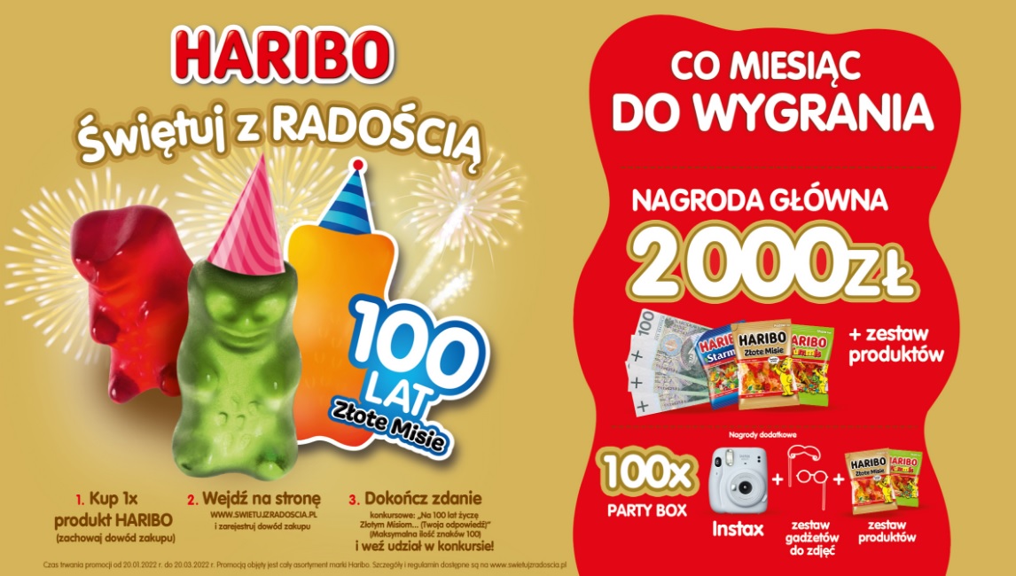 Z okazji 100-lecia ZÅ‚otych Misiów marka HARIBO zaprasza wszystkich do zabawy i udziaÅ‚u w konkursie urodzinowym „ÅšwiÄ™tuj z radoÅ›ciÄ…”. Aby wziąć w nim udziaÅ‚, wystarczy w dniach od 20.01 do 20.03.2022 zakupić dowolny produkt HARIBO, zarejestrować dowód zakupu na dedykowanej stronie www i dokoÅ„czyć zdanie konkursowe „Na 100 lat życzÄ™ ZÅ‚otym Misiom…”.