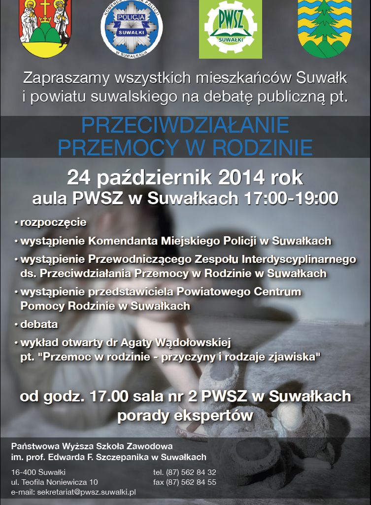 BÄ™dzie można m.in. zapoznać siÄ™ z systemem przeciwdziaÅ‚ania przemocy domowej w naszym mieÅ›cie, jak i na terenie caÅ‚ego powiatu suwalskiego, skorzystać z porad ekspertów oraz wysÅ‚uchać wykÅ‚adu pt. ,,Przemoc w rodzinie-przyczyny i rodzaje zjawiska".