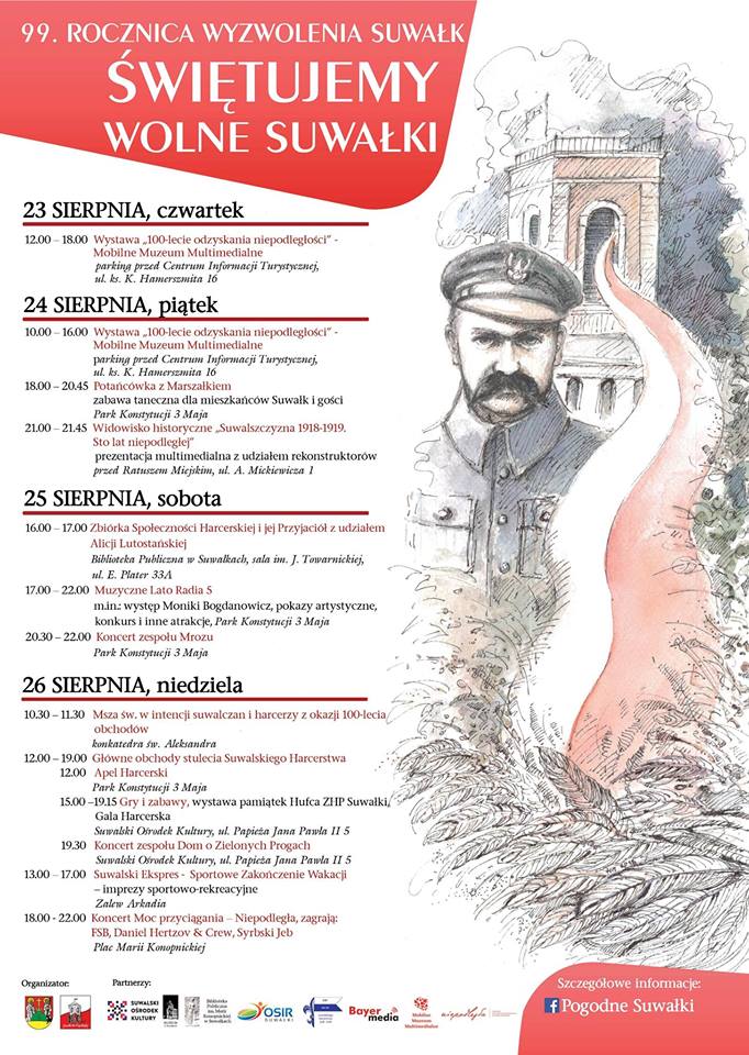 Mieszkańcy Suwałk, którzy wzięli udział w piątkowych (24 sierpnia) obchodach 99. rocznicy wyzwolenia Suwałk mogli świętować tę datę najpierw na Potańcówce z Marszałkiem, a potem wrócić do kart historii dzięki widowisku „Suwalszczyzna 1918-1919. Sto lat niepodległej” – multimedialny pokaz światło-dźwięk. Wszystko odbyło się w klimacie sprzed prawie 100 lat.