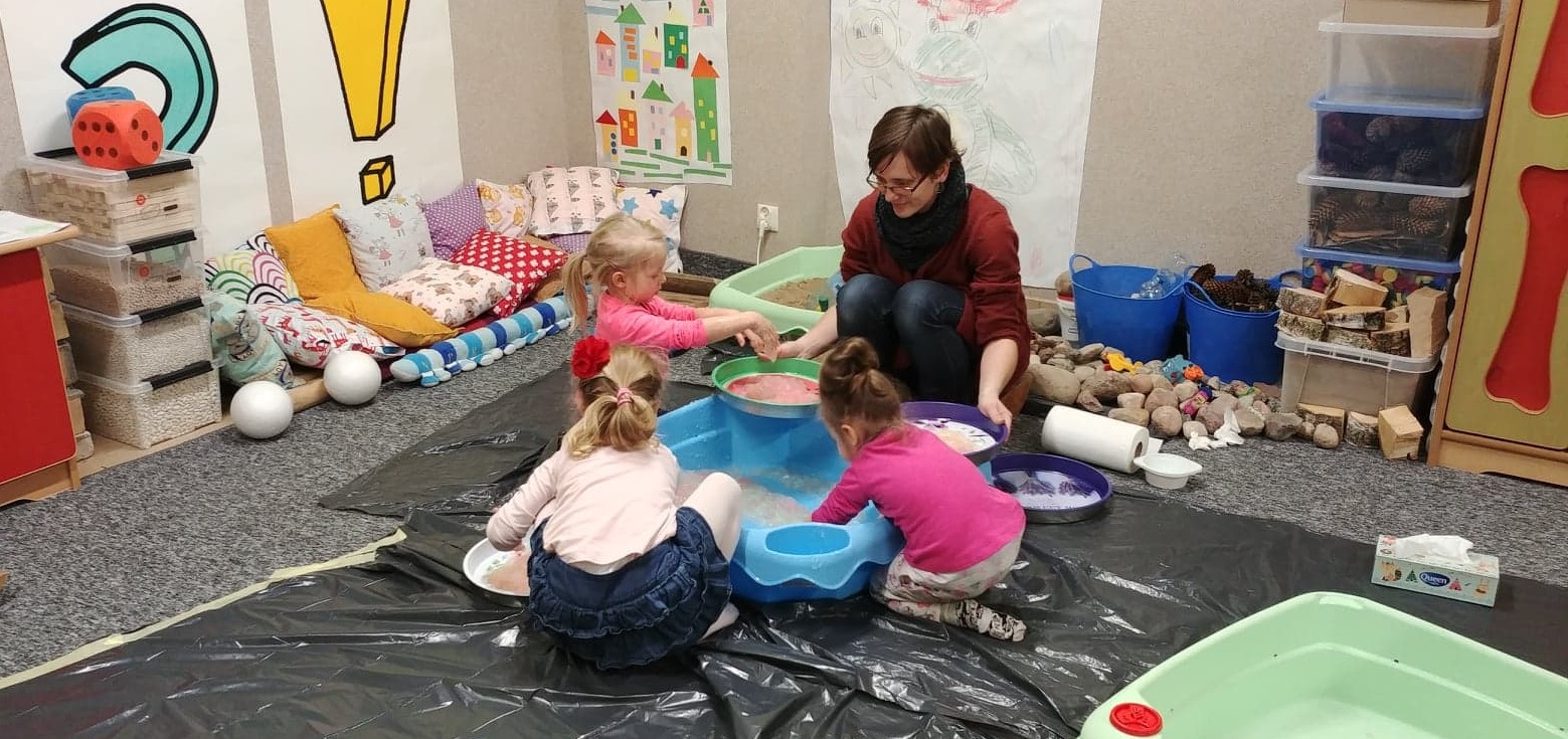 W pokoju zabaw jest basen z fasolą, z grochem, jest piasek, kawałki drewna, patyki, kora, plastikowe nakrętki, kamień czy cegła. Dzieci mają dostęp do tego wszystkiego, czego w domach raczej się nie przechowuje. Mogą dotknąć, poczuć, rozwijają zmysły.