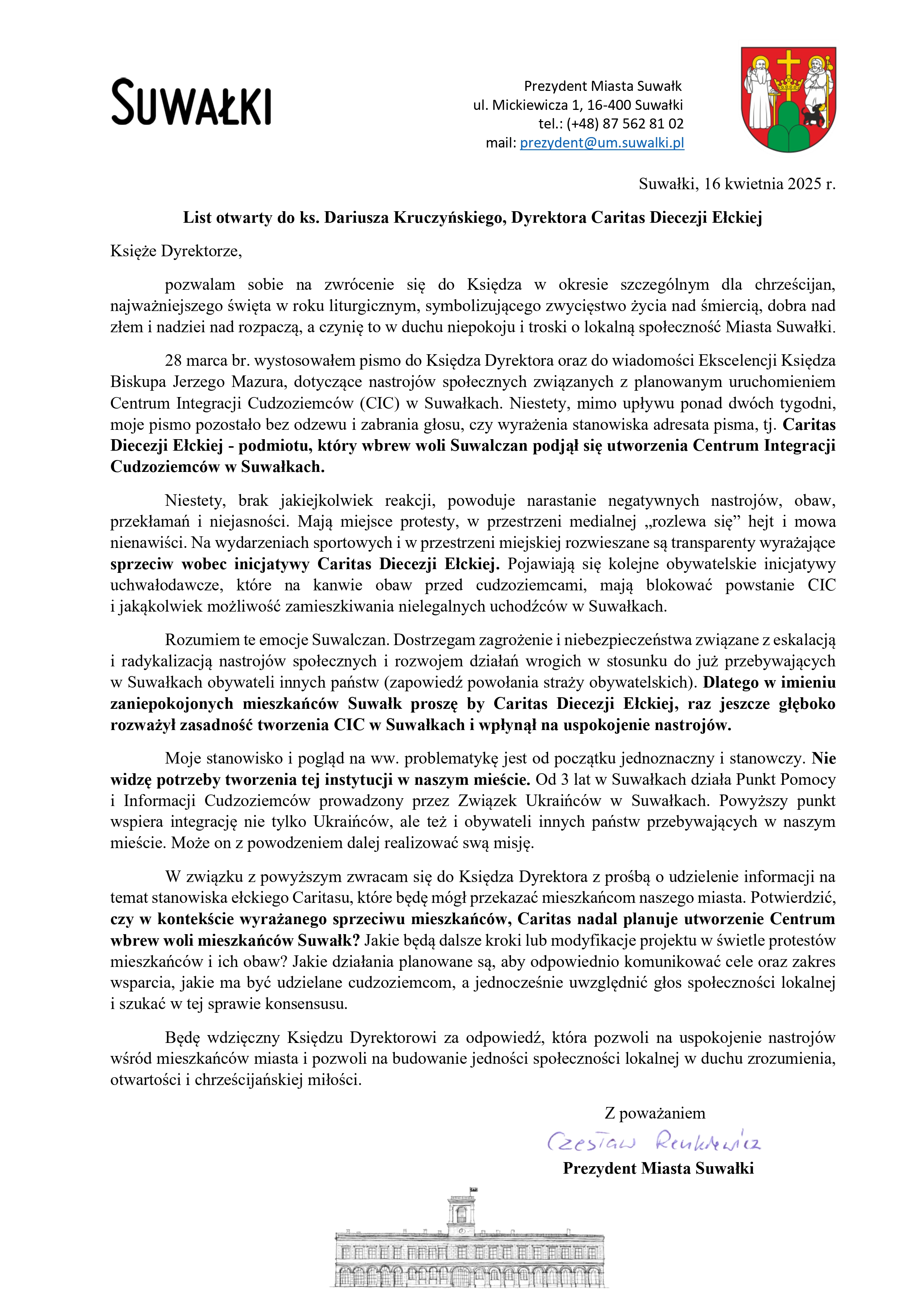 Minęły dwa tygodnie bez udzielenia odpowiedzi, więc prezydent Suwałk Czesław Renkiewicz jeszcze raz, tym razem w liście otwartym pyta ks. Dariusza Kruczyńskiego, czy Caritas Diecezji Ełckiej utworzy w naszym mieście Centrum Integracji Cudzoziemców.