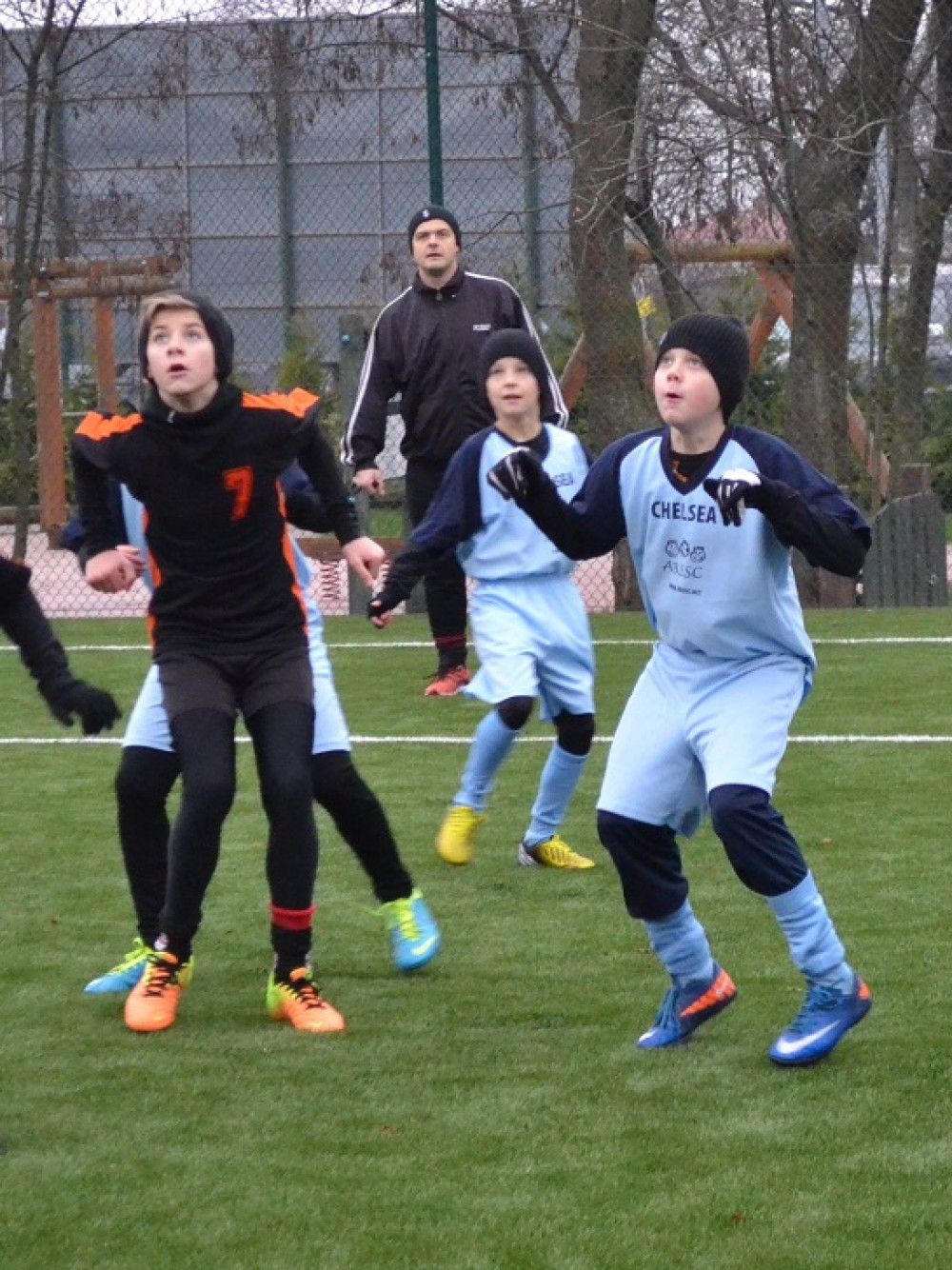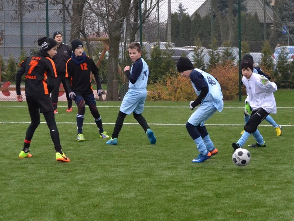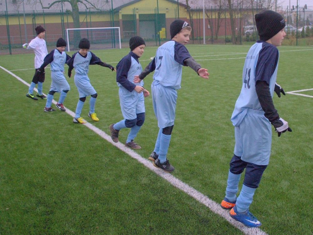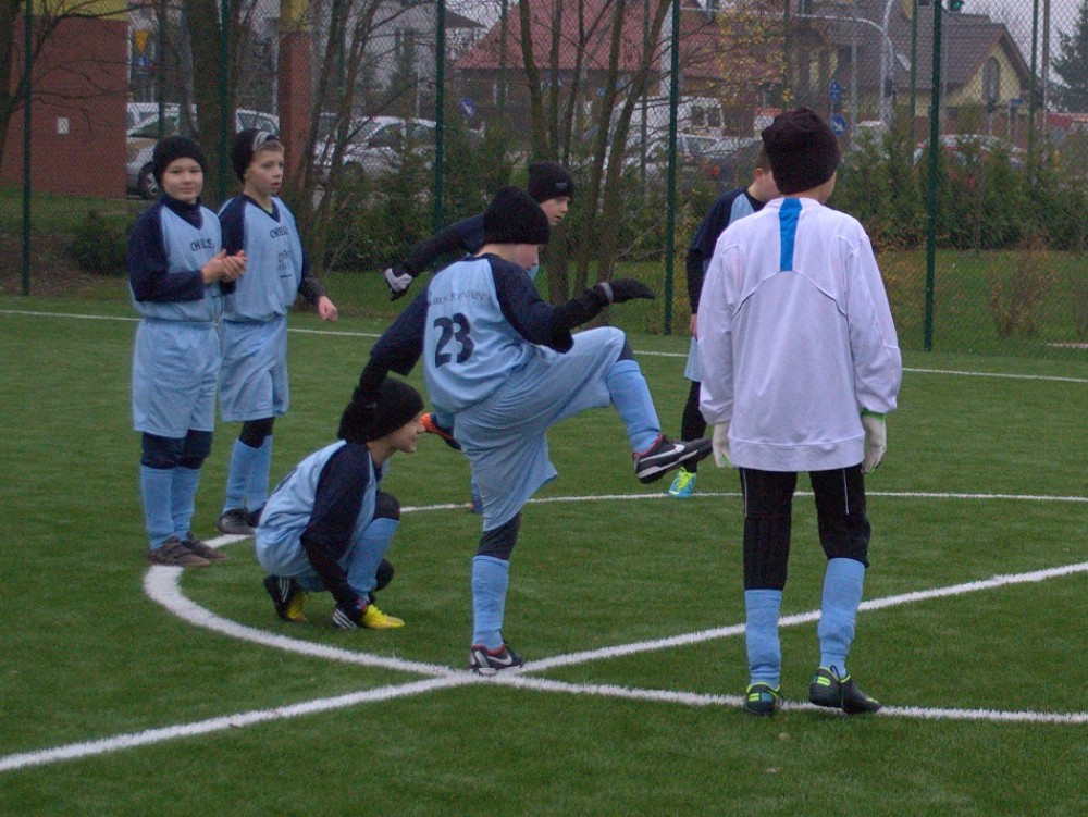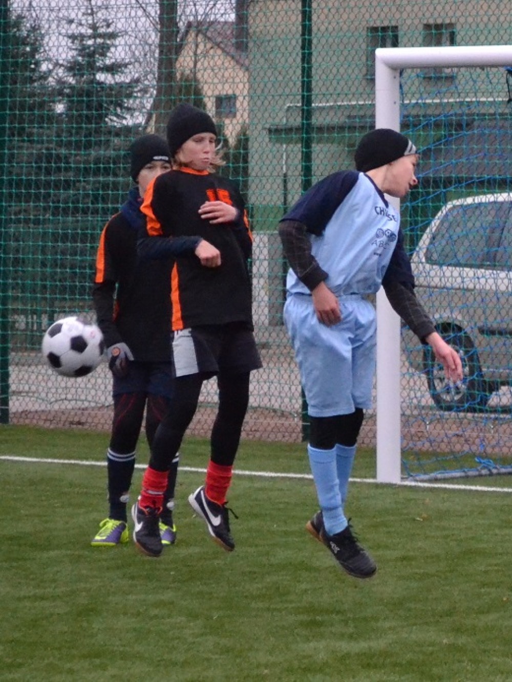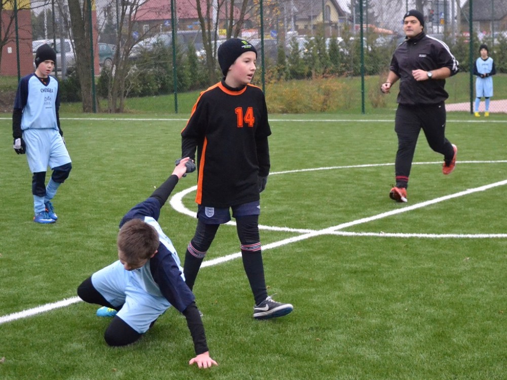 Pierwszy mecz na nowym boisku zakończył się zwycięstwem szóstoklasistów. Pokonali oni młodszą drużynę 3:1.
