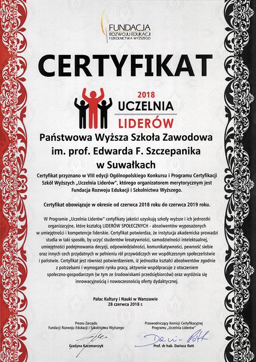 PWSZ w Suwałkach w gronie najlepszych uczelni w kraju. Uczelnia została laureatem Ogólnopolskiego Programu Certyfikacji Szkół Wyższych „UCZELNIA LIDERÓW 2018”, czyli jednego z najbardziej prestiżowych konkursów w Polsce.
