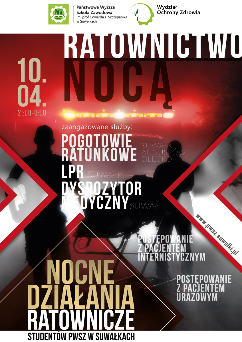 PostÄ™powanie z pacjentem w sytuacjach szczególnych, pacjentem internistycznym, czy urazowym, a wszystko pod osÅ‚onÄ… nocy! To już druga edycja tej, niecodziennej akcji, w której wezmÄ… udziaÅ‚ studenci ratownictwa wszystkich lat. ZajÄ™cia pozwolÄ… im nabyć umiejÄ™tnoÅ›ci pracy w nietypowych i trudnych warunkach. Studenci bÄ™dÄ… musieli wykonać szereg zadaÅ„ pod czujnym okiem i we wspóÅ‚pracy z Dyspozytorem Medycznym z SuwaÅ‚k, Pogotowiem Ratunkowym z Olecka, Augustowa i SuwaÅ‚k oraz Lotniczym Pogotowiem Ratunkowym.