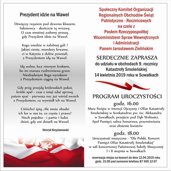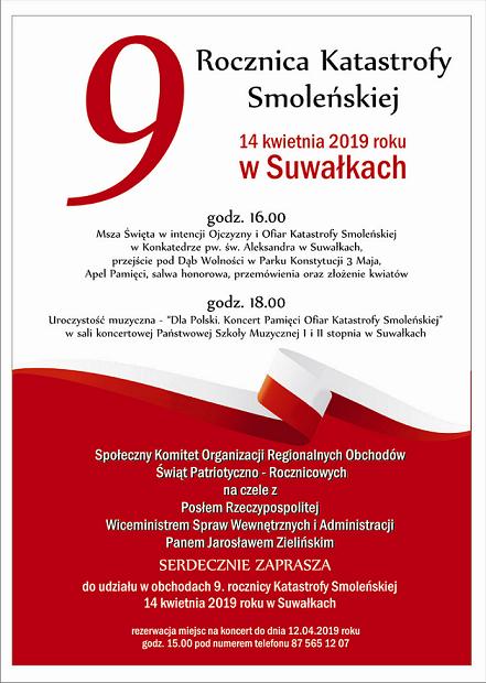 W niedzielÄ™ w PaÅ„stwowej Szkole Muzycznej I i II stopnia w SuwaÅ‚kach odbÄ™dzie siÄ™ koncert Ku PamiÄ™ci Ofiar Katastrofy SmoleÅ„skiej, organizowany przez SpoÅ‚eczny Komitet Organizacji Regionalnych Obchodów Åšwiat Patriotycznych i Rocznicowych z Ministrem JarosÅ‚awem ZieliÅ„skim na czele. Koncert poprzedzi msza Å›wiÄ™ta w konkatedrze pw. Å›w. Aleksandra oraz apel pod DÄ™bem.