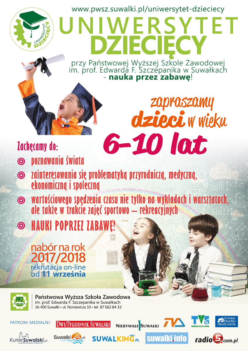 Więcej informacji i formularz rekrutacyjny można znaleźć na: http://www.pwsz.suwalki.pl/uniwersytet-dzieciecy/aktualnosci/zaczynamy-rekrutacje-na-nowy-rok-akademicki,art412/