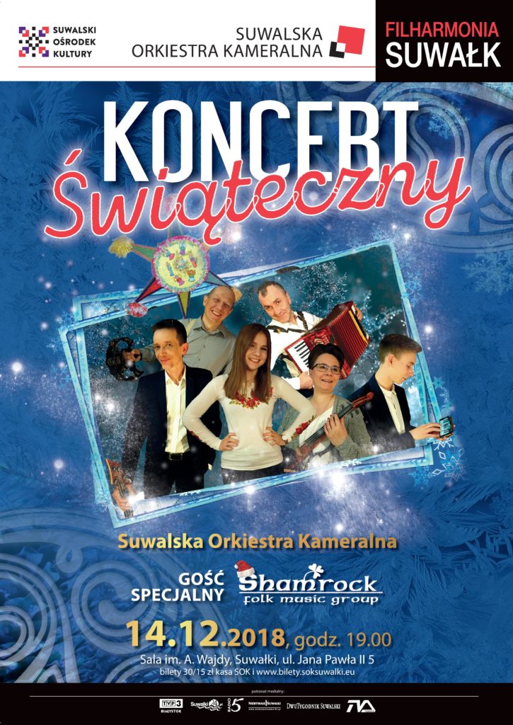 Jaki jest czas przed Bożym Narodzeniem? Refleksyjny, ale i radosny. Tak jak muzyka, którą usłyszymy podczas świątecznego koncertu, na którym wystąpią Suwalska Orkiestra Kameralna i gość specjalny – Shamrock. Rozpoczniemy klasycznie, żeby następnie zaprosić Państwa do wspólnego kolędowania w folkowym, irlandzkim stylu. A do biletu – niespodzianka!