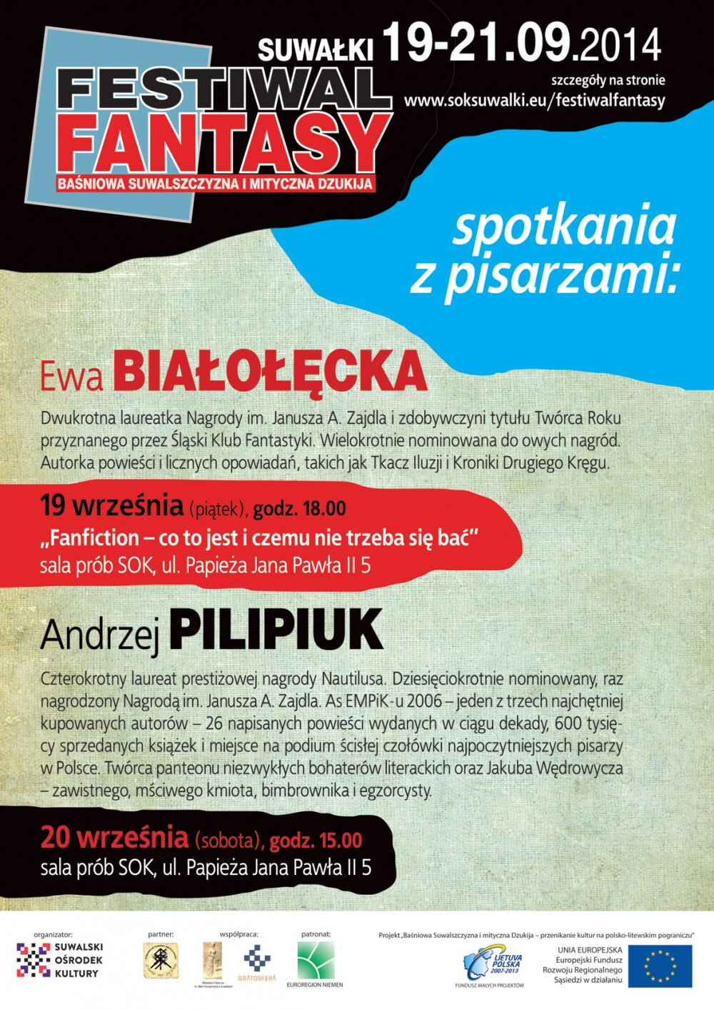 15.00 – spotkanie z Andrzejem Pilipiukiem, sala prób Suwalskiego Ośrodka Kultury, ul. Papieża Jana Pawła II 5. Autor najbardziej znany jest z cyklu opowiadań o przygodach Jakuba Wędrowycza – zamieszkującego w Starym Majdanie koło Wojsławic „plugawego degenerata, bimbrownika i egzorcysty” oraz cyklu o kuzynkach Kruszewskich i Michale Sędziwoju, alchemiku, który zgodnie z legendami zapewnić miał sobie nieśmiertelność dzięki odkryciu tajemnicy kamienia filozoficznego, gdzie autor połączył elementy fabularne oparte na wiedzy historycznej z najnowszymi osiągnięciami naukowymi i technologicznymi.