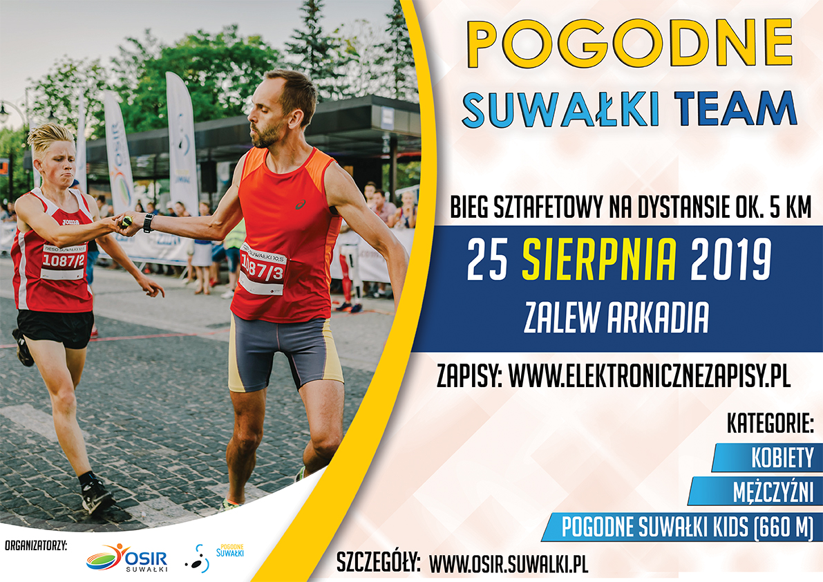 Na zakończenie części sportowej odbędą się biegi sztafetowe dzieci oraz dorosłych. Związane jest to ze zmienioną formułą tegorocznej edycji Sportowego Zakończenie Wakacji. O godz. 15:30 wystartują dzieci w wieku 9 - 14 lat na dystansie ok. 660m (3x220m) w biegu pn. Pogodne Suwałki KIDS. Następnie na starcie staną uczestnicy sztafety Pogodne Suwałki TEAM, w której mogą wziąć udział trzy osobowe drużyny. Każdy z uczestników będzie miał do pokonania dystans ok. 1,7 km (jedno okrążenie wokół zalewu Arkadia). W tym biegu nagrodzone zostaną drużyny w trzech kategoriach: OPEN, Najlepsza Drużyna Kobiet oraz Najlepszy MIXT. Zapisy prowadzone są za pomocą elektronicznych zapisów na stronie: www.elektronicznezapisy.pl.