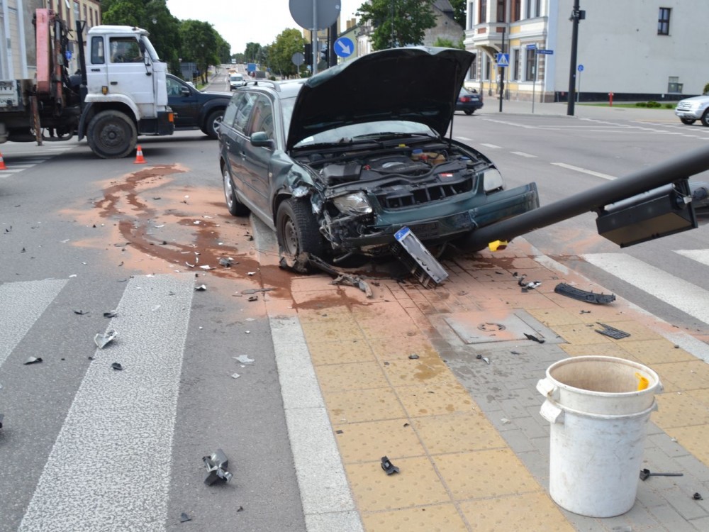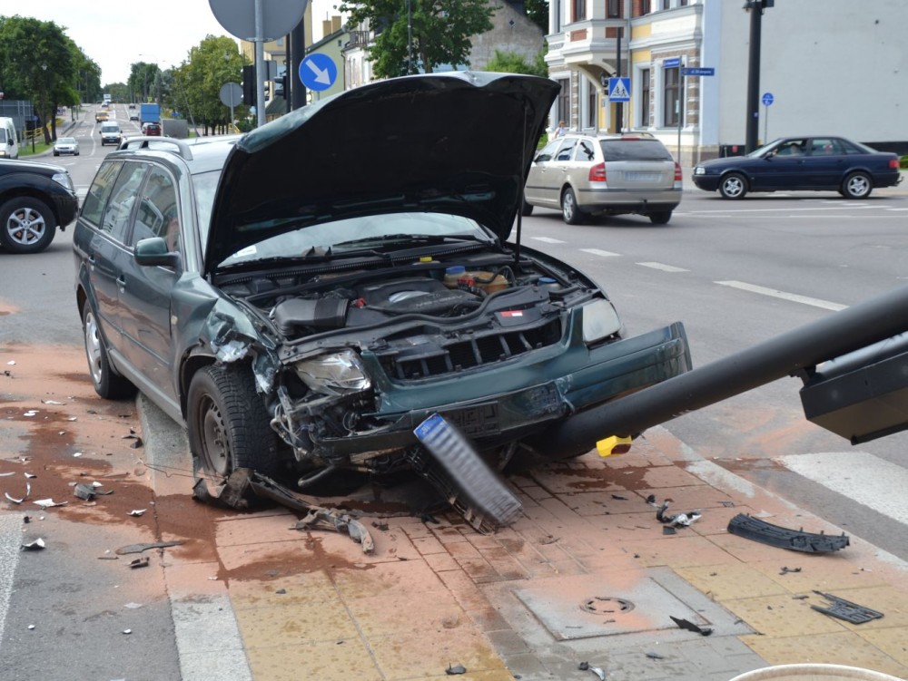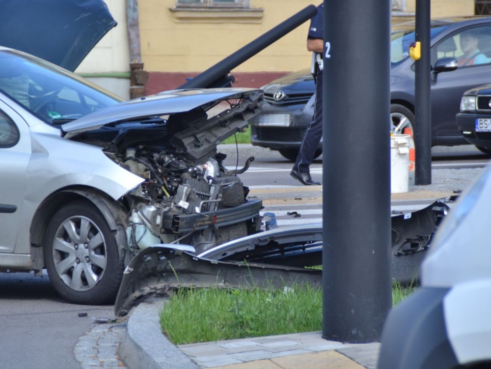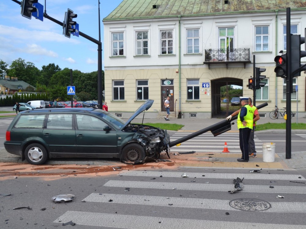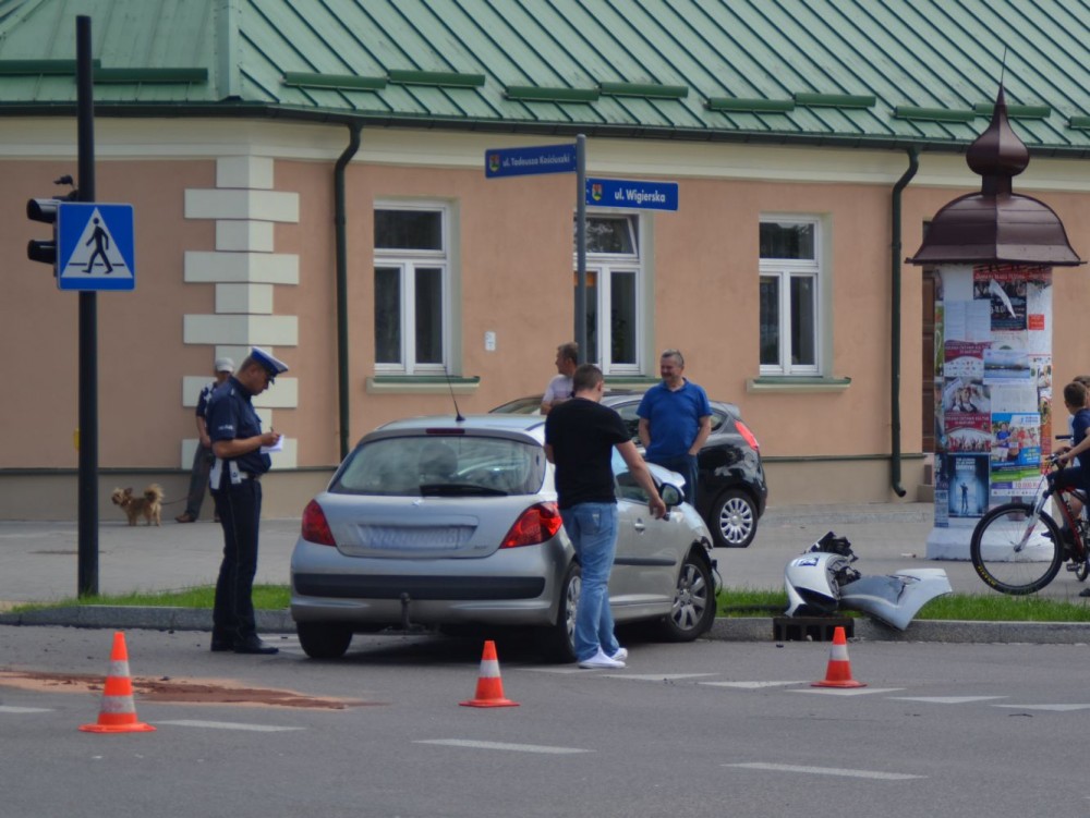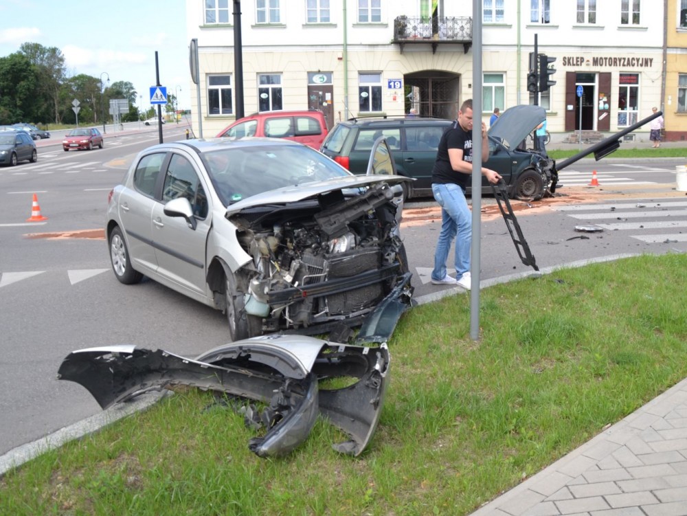 Volkswagen, który na czerwony świetle przejechał skrzyżowanie ulic Kościuszki i Wigierskiej, nie tylko staranował peugeota 207. Auto zatrzymało się dopiero na sygnalizatorze. Sprawca kolizji trafił do szpitale, ale nie odniósł poważnych obrażeń.