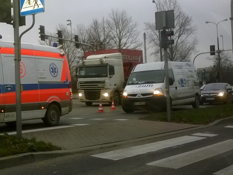 Do kolizji doszÅ‚o dziÅ› w okolicach godziny 8.00 na skrzyżowaniu ulic Dwernickiego, Utrata, Kolejowa. W prawy bok renaulta mastera wjechaÅ‚a tam kobieta kierujÄ…ca, autem tej samej marki, ale w osobowej wersji - clio. PrzybyÅ‚e na miejsce pogotowie, udzieliÅ‚o pomocy kierujÄ…cej kobiecie. UskarżaÅ‚a siÄ™ ona na ból nogi. W wyniku zderzenia uszkodzeniu ulegÅ‚a też prawa strona samochodu dostawczego oraz przód osobówki.