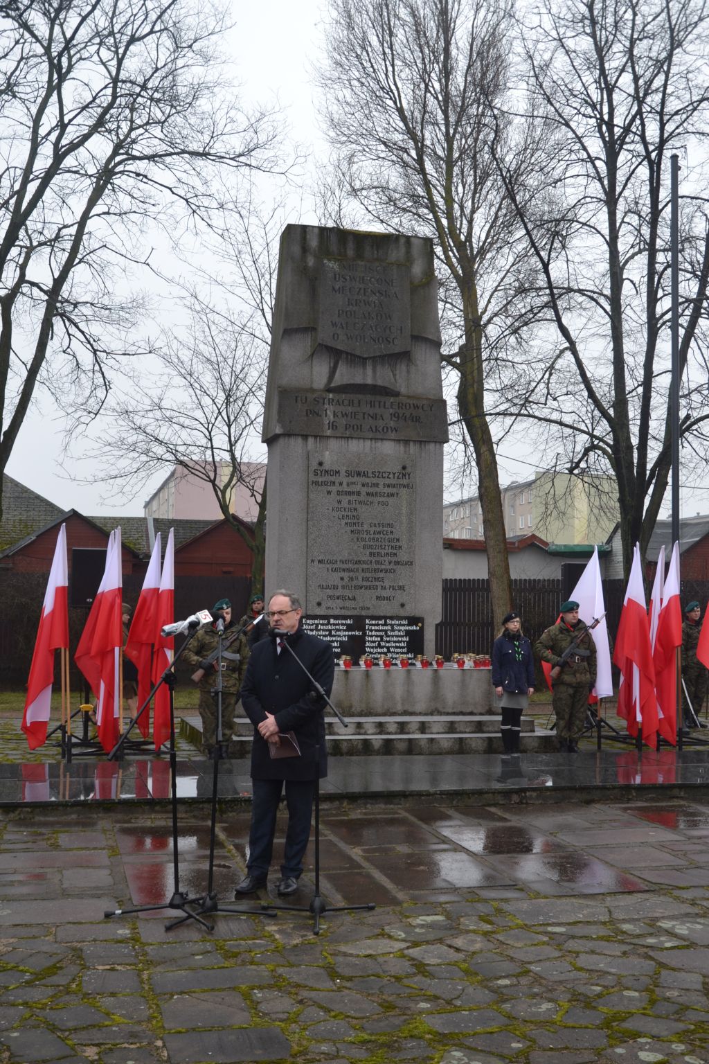 Pod pomnikiem Prezydent Miasta Suwałk – Czesław Renkiewicz w swoim wystąpieniu powiedział między innymi – „Najważniejsza jest pomięć o naszej wspólnej historii, która stanowi podstawę naszej suwalskiej wspólnoty. Udział w takich uroczystościach ludzi w różnym wieku a szczególnie dzieci i młodzieży, buduje podwaliny społeczeństwa obywatelskiego, buduje poczucie wspólnoty suwalskiej.”